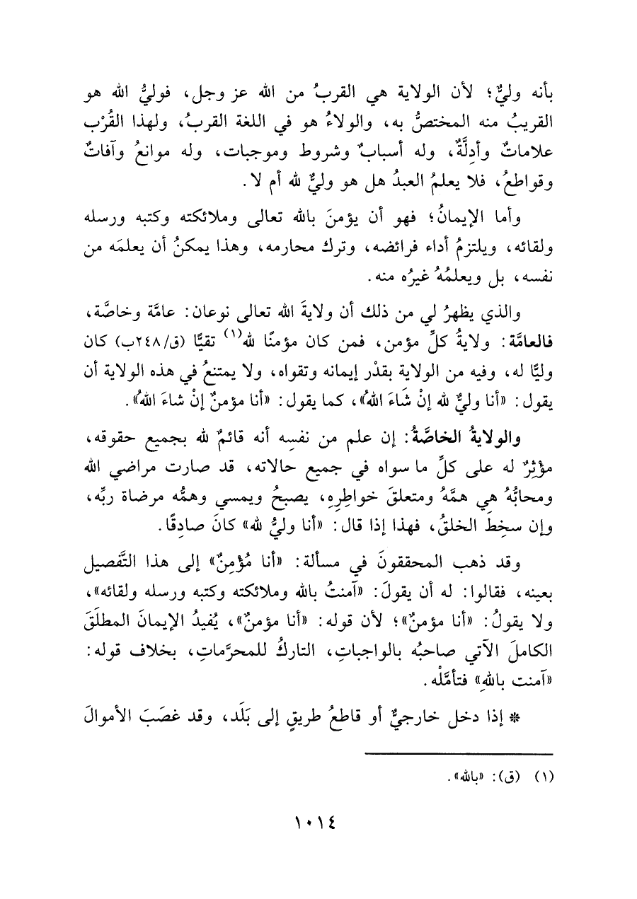 والذي يظهرُ لي من ذلك أن ولايةَ الله تعالى نوعان: عامَّة وخاصَّة، فالعامَّة: ولايةُ كلِّ مؤمن، فمن كان مؤمنًا لله (¬١) تقيًّا (ق/ ٢٤٨ ب) كان وليًّا له، وفيه من الولاية بقدْر إيمانه وتقواه، ولا يمتنعُ في هذه الولاية أن يقول: "أنا وليٌّ لله إنْ شَاءَ اللهُ"، كما يقول: "أنا مؤمنٌ إنْ شاءَ اللهُ".