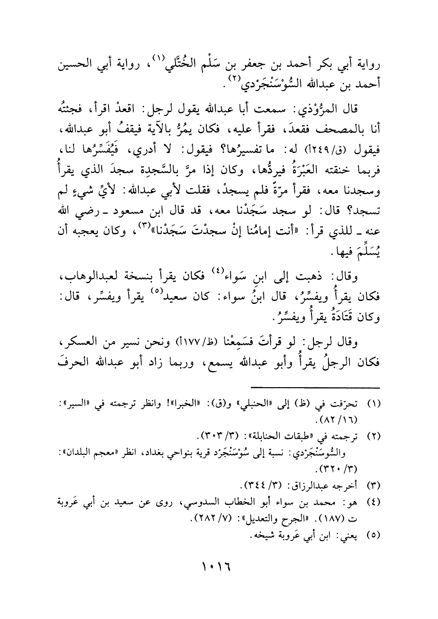 وقال لرجل: لو قرأتَ فسَمِعْنا (ظ/١٧٧ أ) ونحن نسير من العسكر، فكان الرجلُ يقرأُ وأبو عبد الله يسمع، وربما زاد أبو عبد الله الحرفَ