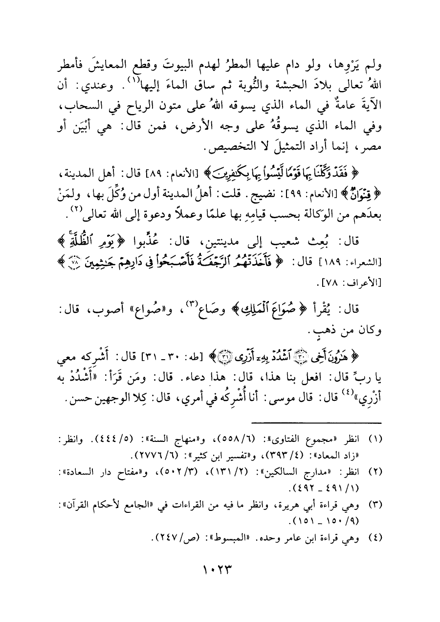 {فَقَدْ وَكَّلْنَا بِهَا قَوْمًا لَيْسُوا بِهَا بِكَافِرِينَ} [الأنعام: ٨٩] قال: أهل المدينة، {قِنْوَانٌ} [الأنعام: ٩٩]: نضيج. قلت: أهلُ المدينة أول من وُكِّلَ بها، ولمَنْ بعدَهم من الوَكالة بحسب قيامِهِ بها علمًا وعملًا ودعوة إلى الله تعالى (¬٢).