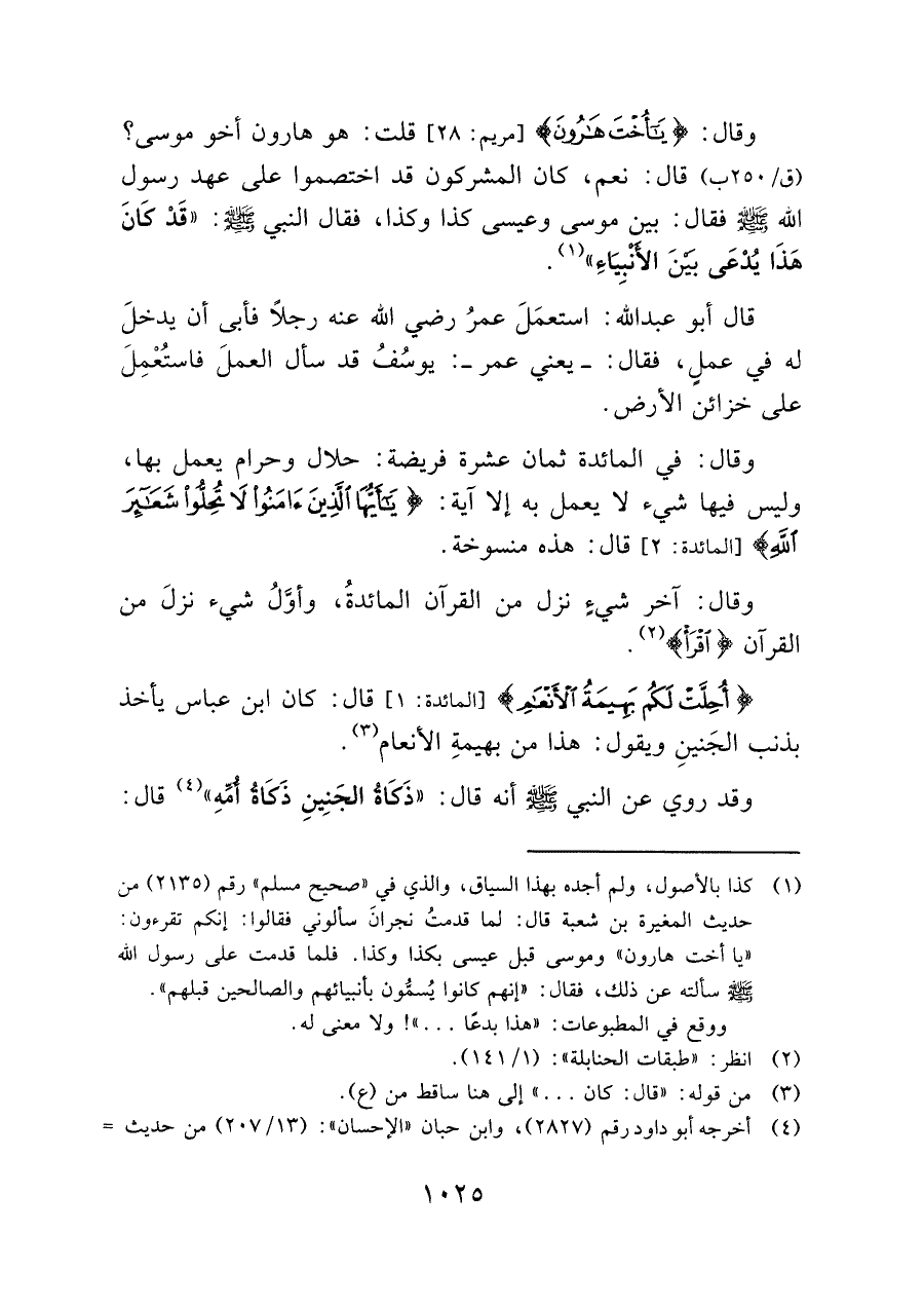 {أُحِلَّتْ لَكُمْ بَهِيمَةُ الْأَنْعَامِ} [المائدة: ١] قال: كان ابن عباس يأخذ بذنب الجَنينِ ويقول: هذا من بهيمةِ الأنعام (¬٣).