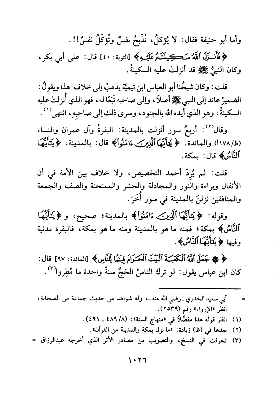قلت: وكان شيخُنا أبو العباس ابن تيميَّة يذهبُ إلى خلاف هذا ويقولُ: الضميرُ عائد إلى النبي - صلى الله عليه وسلم - أصلًا، وإلى صاحبه تَبَعًا له، فهو الذي أُنزلتْ عليه السكينةُ، وهو الذي أيده: الله بالجنود، وسرى ذلك إلى صاحبِهِ، انتهى (¬١).