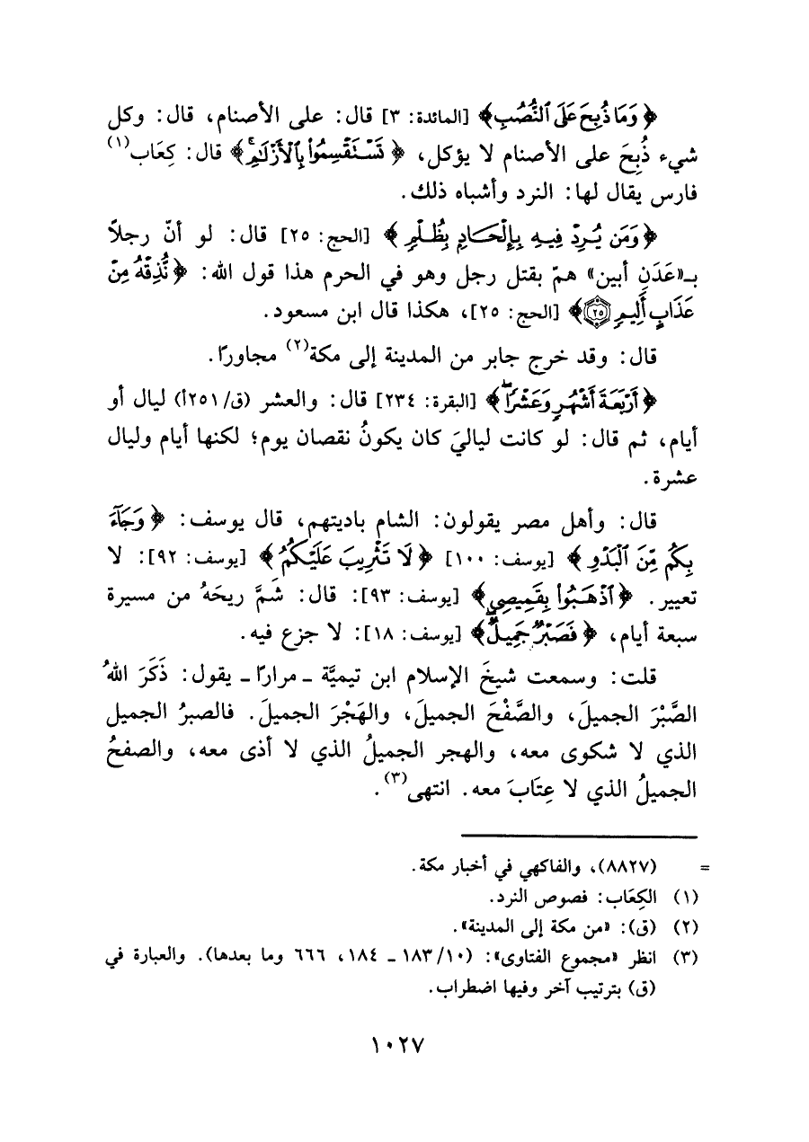 قلت: وسمعت شيخَ الإسلام ابن تيميَّة -مرارًا- يقول: ذَكَرَ اللهُ الصَّبْرَ الجميلَ، والصَّفْحَ الجميلَ، والهَجْرَ الجميلَ. فالصبرُ الجميل الذي لا شكوى معه، والهجر الجميلُ الذي لا أذى معه، والصفحُ الجميلُ الذي لا عِتَابَ معه. انتهى (¬٣).