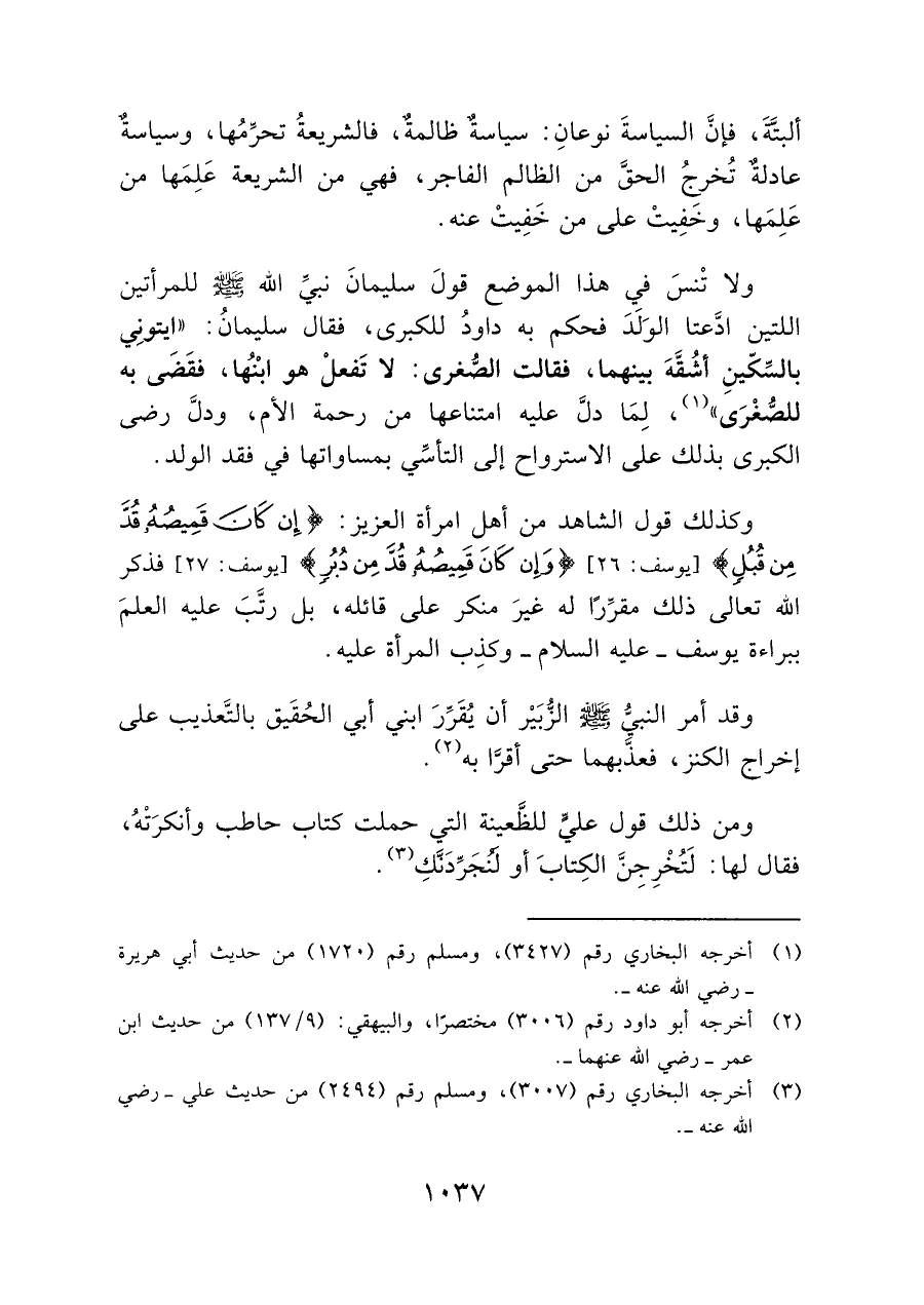 ولا تْنسَ في هذا الموضع قولَ سليمانَ نبيِّ الله - صلى الله عليه وسلم - للمرأتين اللتين ادَّعتا الوَلَدَ فحكم به داودُ للكبرى، فقال سليمانُ: "ايتونِي بالسِّكّينِ أشُقَّهَ بينهما، فقالت الصُّغرى: لا تَفعلْ هو ابْنُها، فقَضَى به للصُّغْرَى" (¬١)، لِمَا دلَّ عليه امتناعها من رحمة الأم، ودلَّ رضى الكبرى بذلك على الاسترواح إلى التأسِّي بمساواتها في فقد الولد.