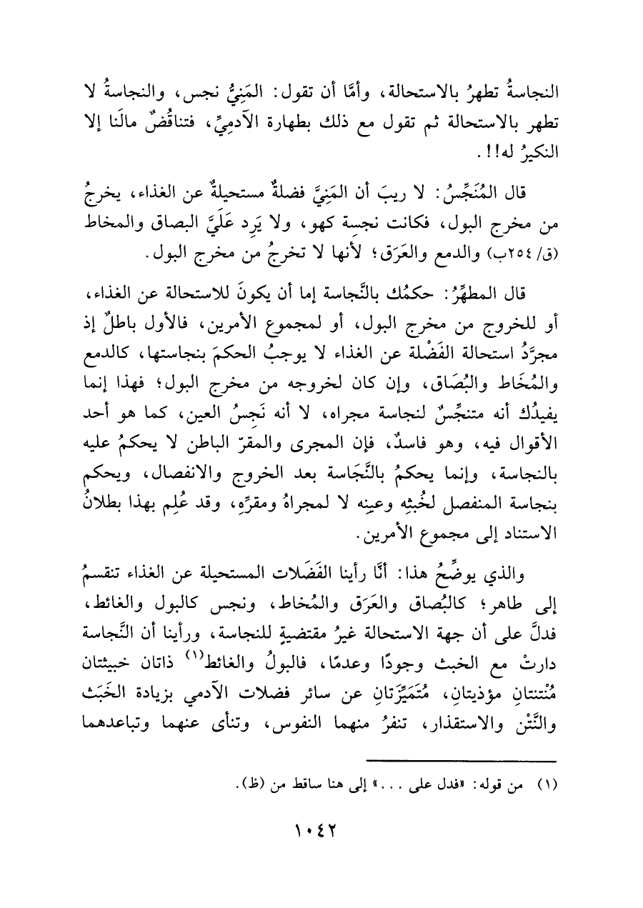 قال المطهِّرُ: حكمُك بالنَّجاسة إما أن يكونَ للاستحالة عن الغذاء، أو للخروج من مخرج البول، أو لمجموع الأمرين، فالأول باطلٌ إذ مجرَّدُ استحالة الفَضْلة عن الغذاء لا يوجبُ الحكمَ بنجاستها، كالدمع والمُخَاط والبُصَاق، وإن كان لخروجه من مخرج البول؛ فهذا إنما يفيدُك أنه متنجِّسٌ لنجاسة مجراه، لا أنه نَجِسُ العين، كما هو أحد الأقوال فيه، وهو فاسدٌ، فإن المجرى والمقرّ الباطن لا يحكمُ عليه بالنجاسة، وإنما يحكمُ بالنَّجَاسة بعد الخروج والانفصال، ويحكم بنجاسة المنفصل لخُبثِه وعينِه لا لمجراهُ ومقرِّهِ، وقد عُلِم بهذا بطلانُ الاستناد إلى مجموع الأمرين.