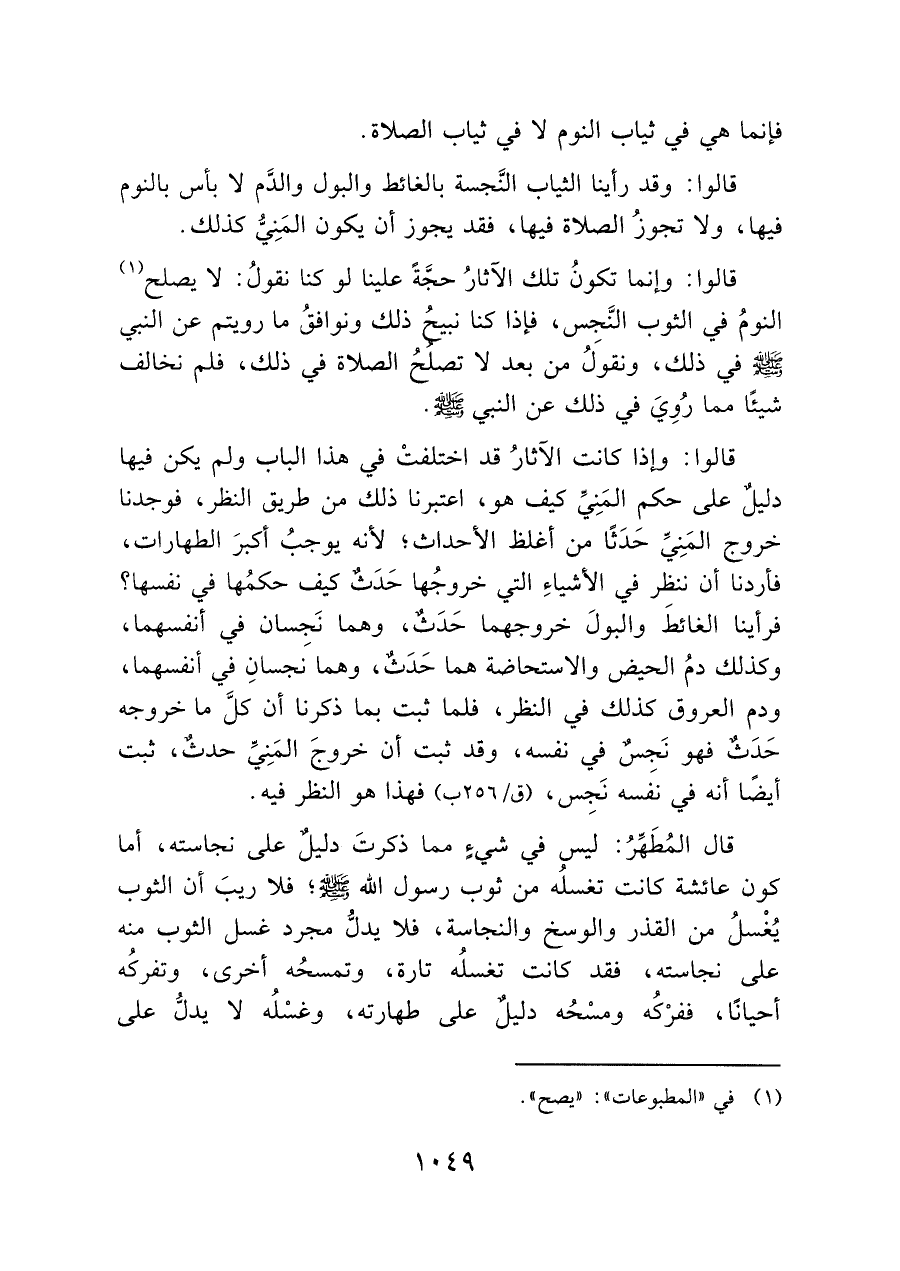 قالوا: وقد رأينا الثياب النَّجسة بالغائط والبول والدَّم لا بأس بالنوم فيها، ولا تجوزُ الصلاة فيها، فقد يجوز أن يكون المَنِيُّ كذلك.