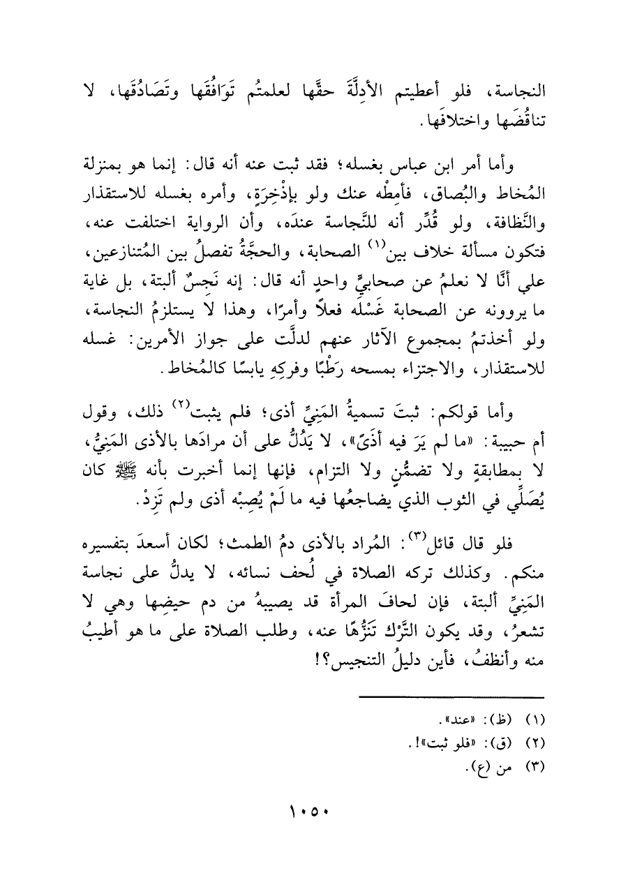 النجاسة، فلو أعطيتم الأدِلَّةَ حقَّها لعلمتُم تَوَافُقَها وتَصَادُقَها، لا تناقُضَها واختلافَها.