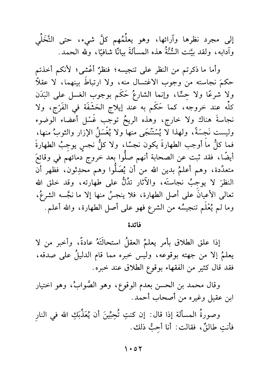 إلى مجرد نظرها وآرائها، وهو يعلِّمُهم كلَّ شيء، حتى التَّخَلِّي وآدابه، ولقد بيَّنت السُّنَّةُ هذه المسألةَ بيانًا شافيًا، ولله الحمد.