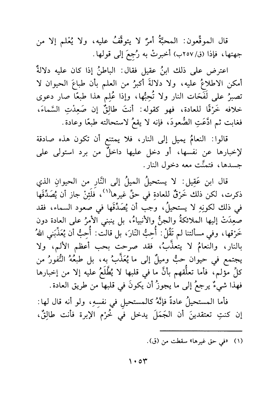 قال ابن عَقِيل: لا يستحيلُ الميلُ إلى النَّارِ من الحيوانِ الذي ذكرت، لكن ذلك خَرْقٌ للعادةِ في حقِّ غيرها (¬١)، فَلَئِنْ جاز أن يُصَدِّقَها في ذلك لكونِهِ لا يستحيلُ، وجب أن يُصَدِّقَها في صعود السماء، فقد صعِدَتْ إليها الملائكةُ والجنُّ والأنبياءُ، بل ينبني الأمرُ على العادة دون خَرْقها، وفي مسألتنا لم تَقُلْ: أُحِبُّ النّارَ، بل قالت: أُحِبُّ أن يُعَذِّبَني اللهُ بالنار، والنعامُ لا يتعذَّبُ، فقد صرحت بحب أعظم الألم، ولا يجتمع في حيوان حبٌّ وميلٌ إلى ما يُعَذَّبُ به، بل طبعُهُ النُّفورُ من كلِّ مؤلم، فأما تعلُّقهم بأنَّ ما في قلبها لا يُطَّلَعُ عليه إلا من إخبارها فهذا شيءٌ يرجعُ إلى ما يجوزُ أن يكونَ في قلبها من طريق العادة.