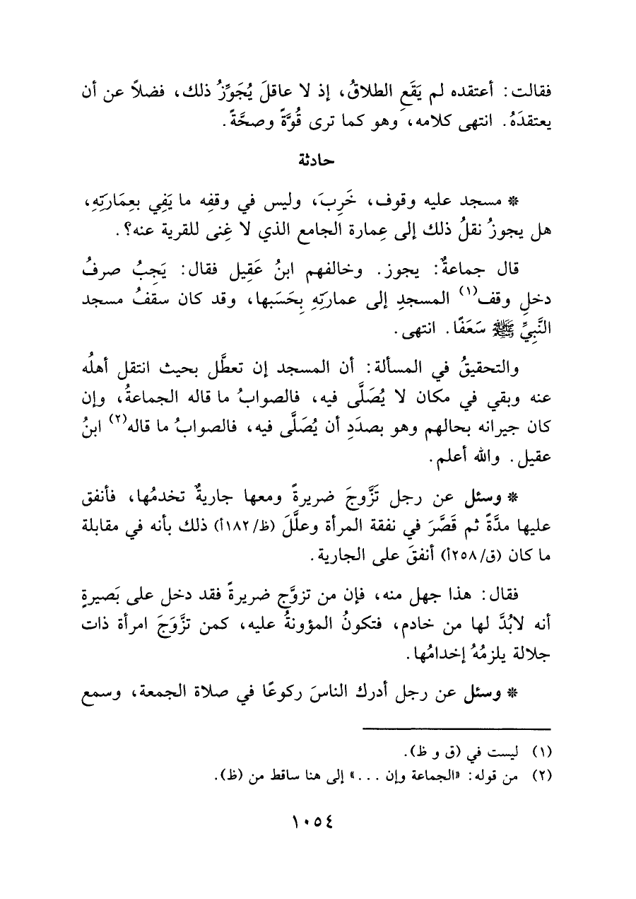 والتحقيقُ في المسألة: أن المسجد إن تعطَّل بحيث انتقل أهلُه عنه وبقي في مكان لا يُصَلَّى فيه، فالصوابُ ما قاله الجماعةُ، وإن كالت جيرانه بحالهم وهو بصدَدِ أن يُصَلَّى فيه، فالصوابُ ما قاله (¬٢) ابنُ عقيل. والله أعلم.