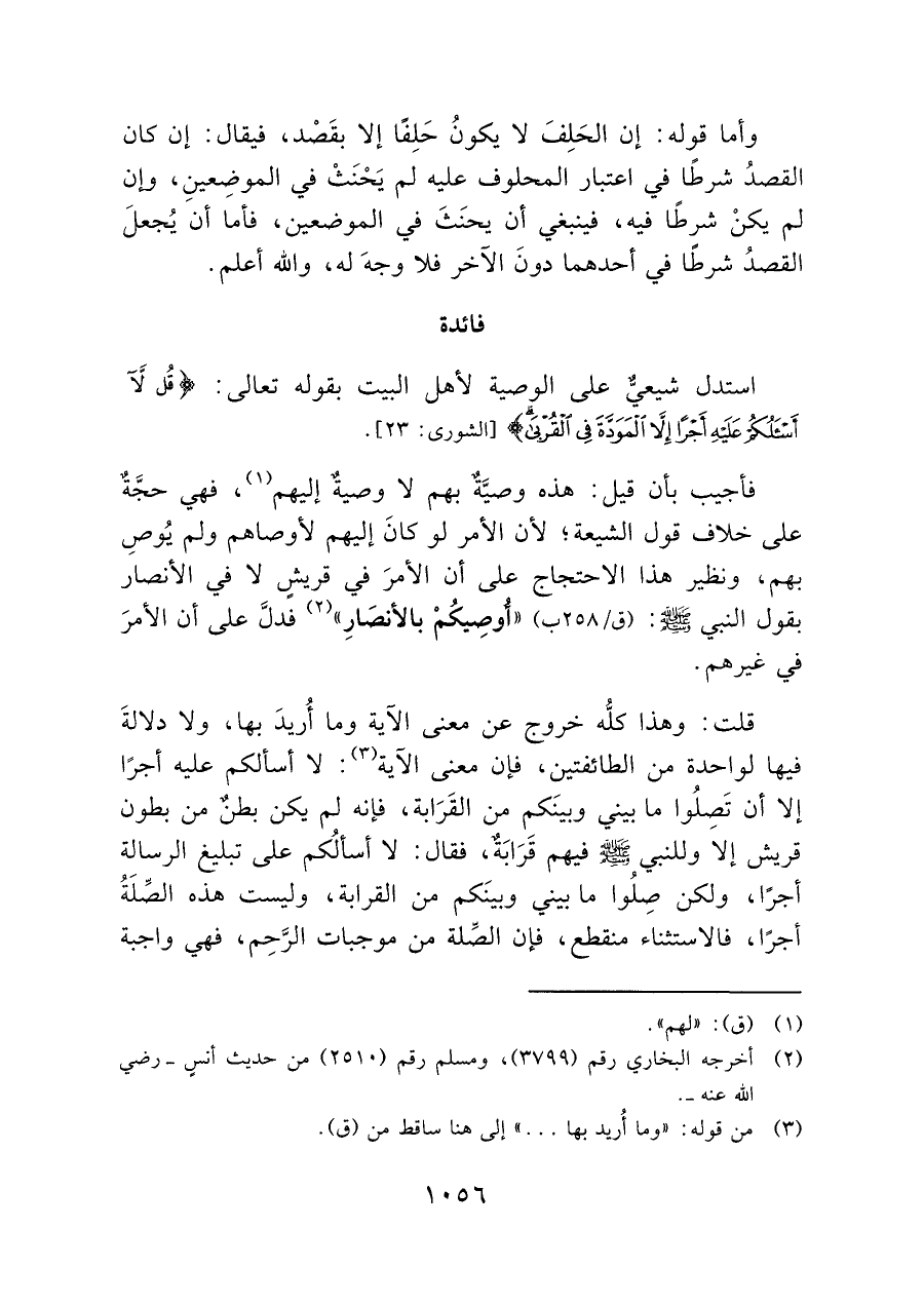 قلت: وهذا كلُّه خروج عن معنى الآية وما أُريدَ بها، ولا دلالةَ فيها لواحدة من الطائفتين، فإن معنى الآية (¬٣): لا أسألكم عليه أجرًا إلا أن تَصِلُوا ما بيني وبينَكم من القَرَابة، فإنه لم يكن بطنٌ من بطون قريش إلا وللنبي - صلى الله عليه وسلم - فيهم قَرَابَةٌ، فقال: لا أسألُكم على تبليغ الرسالة أجرًا، ولكن صِلُوا ما بيني وبينَكم من القرابة، وليست هذه الصِّلَةُ أجرًا، فالاستثناء منقطع، فإن الصِّلة من موجبات الرَّحِم، فهي واجبة