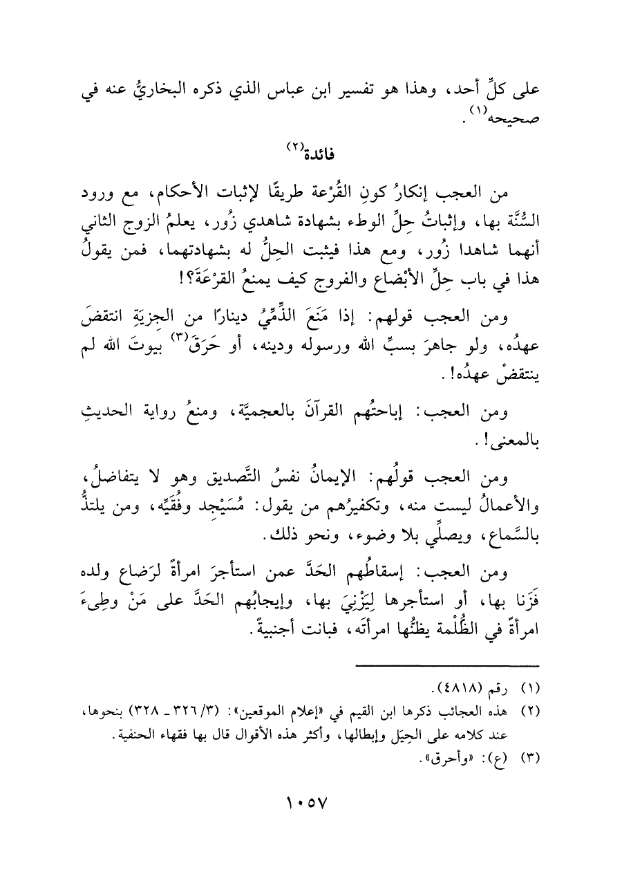 (¬٢) هذه العجائب ذكرها ابن القيم في "إعلام الموقعين": (٣/ ٣٢٦ - ٣٢٨) بنحوها، عند كلامه على الحِيَل وإبطالها، وأكثر هذه الأقوال قال بها فقهاء الحنفية.