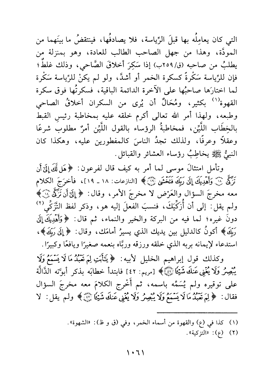 التي كان يعامِلُه بها قبلَ الرِّياسة، فلا يصادفُها، فينتقضُ ما بينهما من المودَّة، وهذا من جهل الصاحب الطالب للعادة، وهو بمنزلة من يطلبُ من صاحبه إذا سَكِرَ أخلاقَ الصَّاحي، وذلك غلطٌ؛ فإن للرِّياسة سَكْرةً كسكرة الخمر أو أشدَّ، ولو لم يكنْ للرِّياسة سَكْرة لما اختارَها صاحبُها على الآخرة الدائمة الباقية، فسكرتُها فوق سكرة القهوة (¬١) بكثير، ومُحَالٌ أن يُرى من السكران أخلاقُ الصاحي وطبعه، ولهذا أمر الله تعالى أكرم خلقه عليه بمخاطبة رئيسِ القبط بالخِطَاب اللَّيِّن، فمخاطبةُ الرؤساء بالقول اللَّيِّن أمرٌ مطلوب شرعًا وعقلًا وعرفًا، ولذلك تجدُ الناسَ كالمفطورين عليه، وهكذا كان النبيُّ - صلى الله عليه وسلم - يخاطِبُ رؤساء العشائر والقبائل.