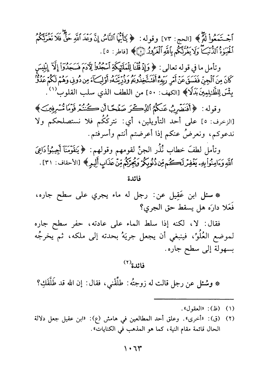 وتأمل ما في قوله تعالى: {وَإِذْ قُلْنَا لِلْمَلَائِكَةِ اسْجُدُوا لِآدَمَ فَسَجَدُوا إِلَّا إِبْلِيسَ كَانَ مِنَ الْجِنِّ فَفَسَقَ عَنْ أَمْرِ رَبِّهِ أَفَتَتَّخِذُونَهُ وَذُرِّيَّتَهُ أَوْلِيَاءَ مِنْ دُونِي وَهُمْ لَكُمْ عَدُوٌّ بِئْسَ لِلظَّالِمِينَ بَدَلًا} [الكهف: ٥٠] من اللطف الذي سلب القلوب (¬١).