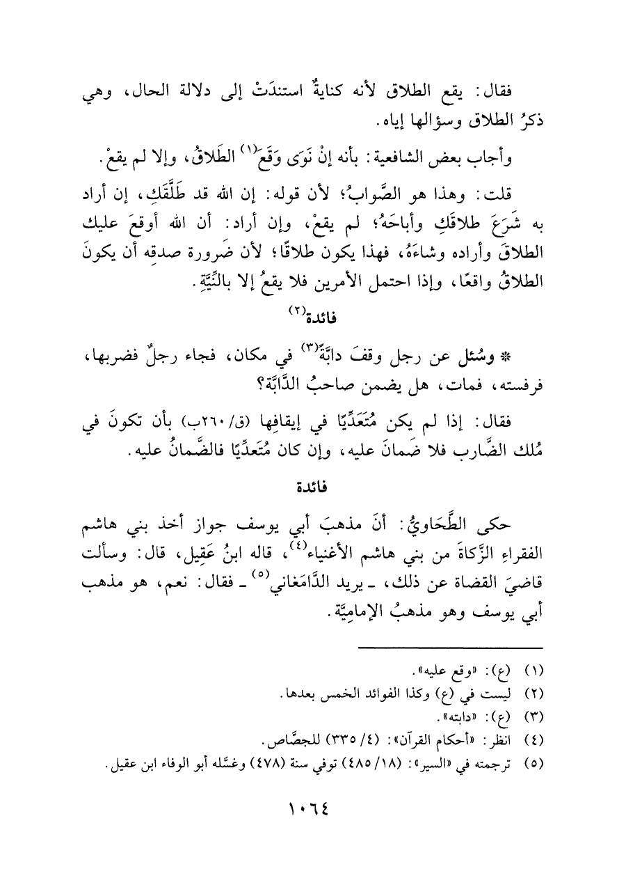 حكى الطَّحَاويُّ: أنَ مذهبَ أبي يوسف جواز أخذ بني هاشم الفقراءِ الزَّكاةَ من بني هاشم الأغنياء (¬٤)، قاله ابنُ عَقِيل، قال: وسألت قاضيَ القضاة عن ذلك، -يريد الدَّامَغاني (¬٥) - فقال: نعم، هو مذهب أبي يوسف وهو مذهبُ الإمامِيَّة.
