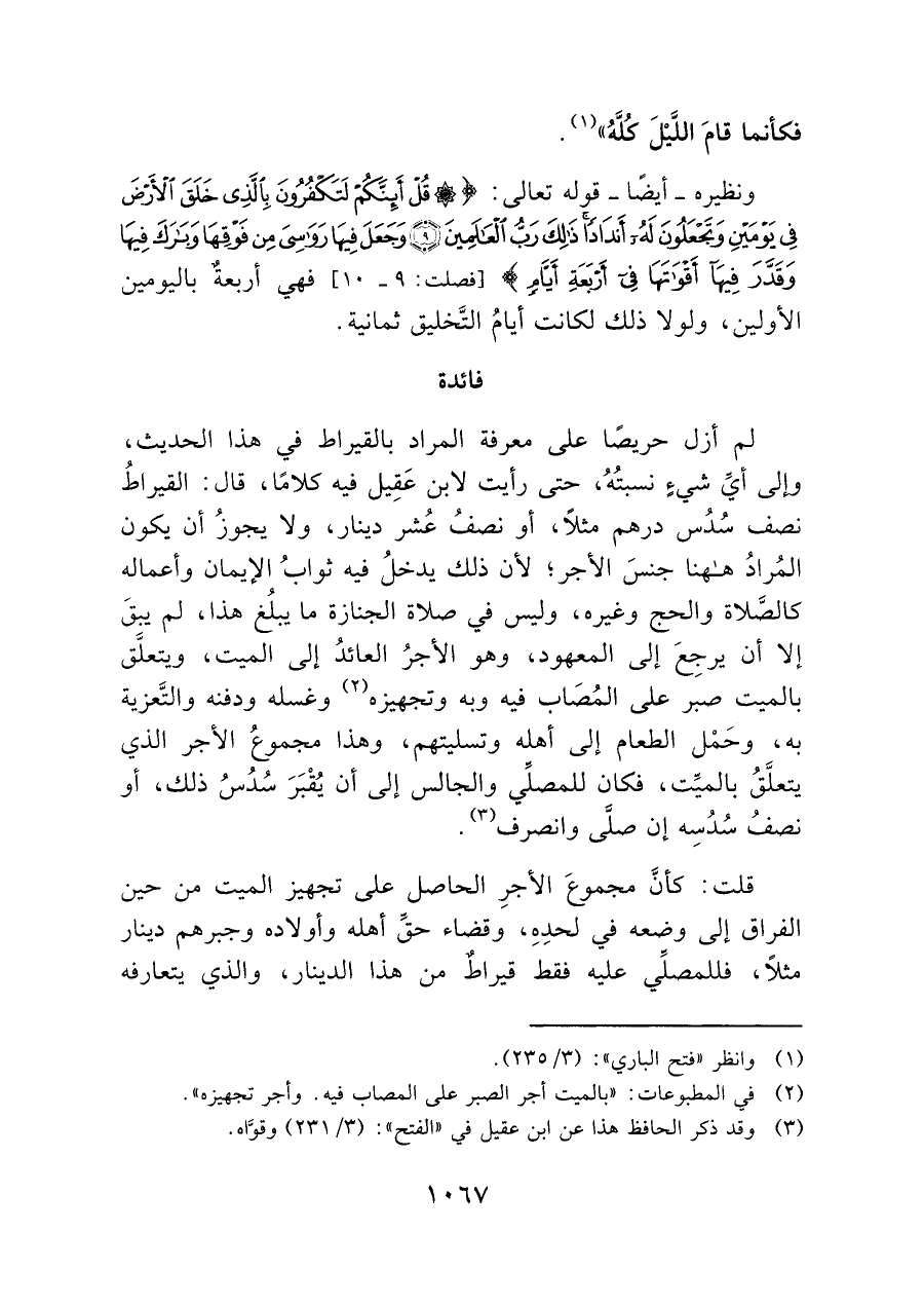 قلت: كأنَّ مجموعَ الأجرِ الحاصل على تجهيز الميت من حين الفراق إلى وضعه في لحدِهِ، وقضاء حقِّ أهله وأولاده وجبرهم دينار مثلًا، فللمصلِّي عليه فقط قيراطٌ من هذا الدينار، والذي يتعارفه