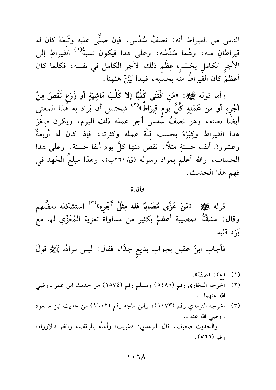 الناس من القيراط أنه: نصف سُدُس، فإن صلَّى عليه وتَبِعَهُ كان له قيراطانِ منه، وهُما سُدُسُه، وعلى هذا فيكون نسبةُ (¬١) القيراطِ إلى الأجرِ الكاملِ بحَسَبِ: عِظَمِ ذلك الأجر الكامل في نفسه، فكلما كان أعظمَ كان القيراطُ منه بحسبه، فهذا بَيِّنٌ هاهنا.
