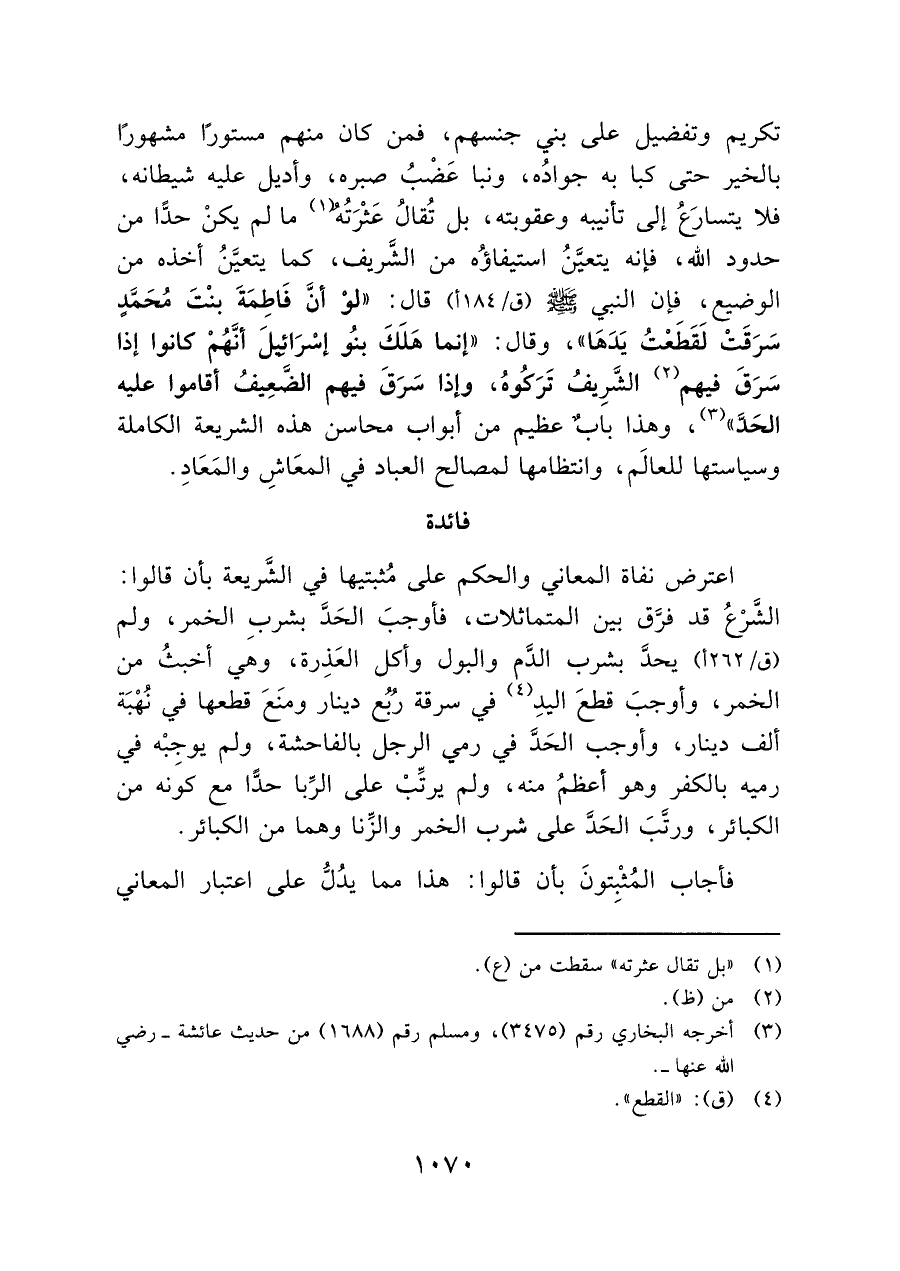 تكريم وتفضيل على بني جنسهم، فمن كان منهم مستورًا مشهورًا بالخير حتى كبا به جوادُه، ونبا عَضْبُ صبره، وأديل عليه شيطانه، فلا يتسارَعُ إلى تأنيبه وعقوبته، بل تُقالُ عَثْرَتُهُ (¬١) ما لم يكنْ حدًّا من حدود الله، فإنه يتعيَّنُ استيفاؤُه من الشَّريف، كما يتعيَّنُ أخذه من الوضيع، فإن النبي - صلى الله عليه وسلم - قال: "لوْ أنَّ فَاطِمَةَ بنْتَ مُحَمَّدٍ سَرَقَتْ لَقَطَعْتُ يَدَهَا"، وقال: "إنما هَلَكَ بنُو إسْرَائِيل أنَّهُمْ كانوا إذا سَرَقَ فيهم (¬٢) الشَّرِيفُ تَرَكُوهُ، وإذا سَرَقَ فيهم الضَّعِيفُ أقاموا عليه الحَدَّ" (¬٣)، وهذا بابٌ عظيم من أبواب محاسن هذه الشريعة الكاملة وسياستها للعالمَ، وانتظامها لمصالح العباد في المعَاشِ والمَعَادِ.