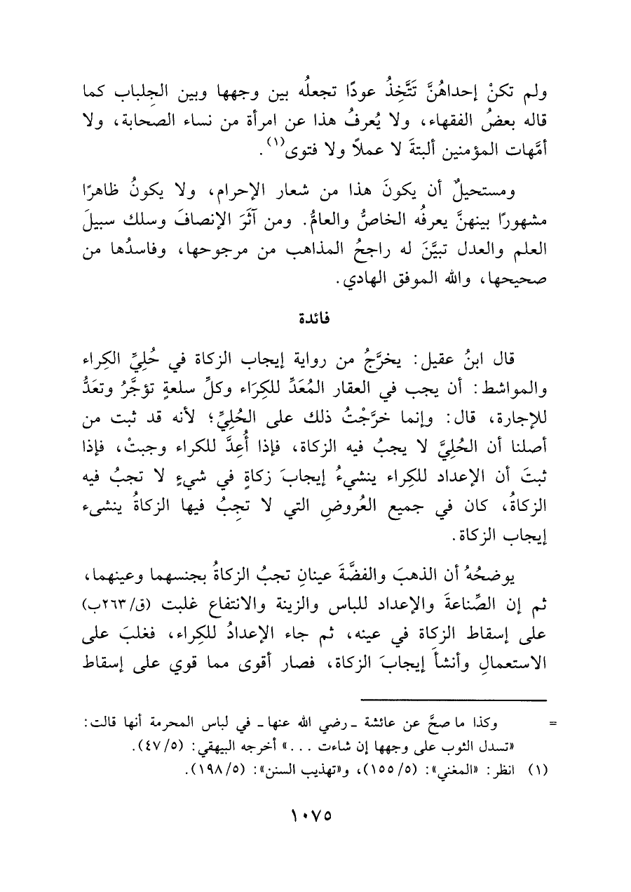 ومستحيلٌ أن يكونَ هذا من شعار الإحرام، ولا يكون ظاهرًا مشهورًا بينهنَّ يعرفه الخاصُّ والعامُّ. ومن آثَرَ الإنصافَ وسلك سبيلَ العلم والعدل تبيَّنَ له راجحُ المذاهب من مرجوحها، وفاسدُها من صحيحها، والله الموفق الهادي.