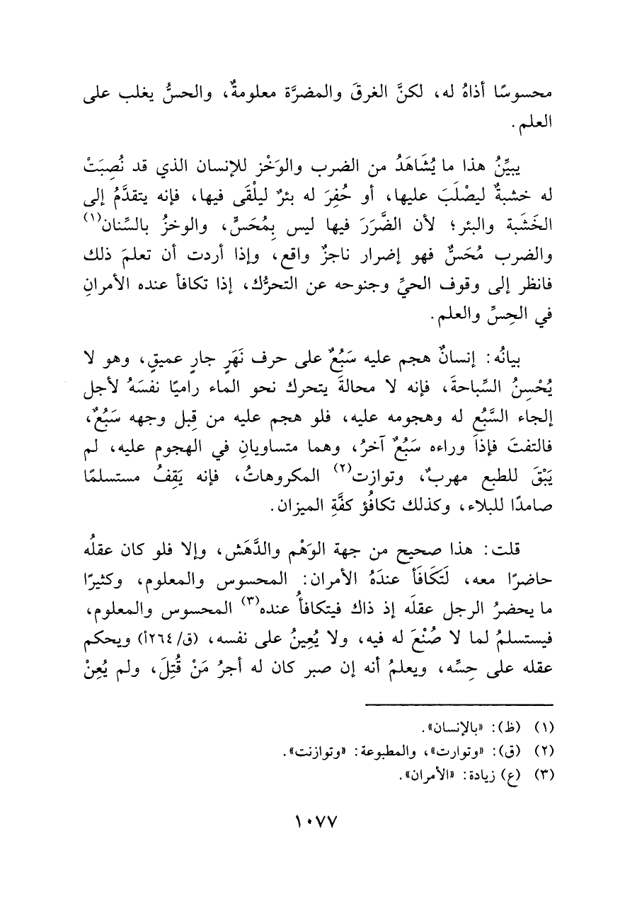 قلت: هذا صحيح من جهة الوَهْم والدَّهَش، وإلا فلو كان عقلُه حاضرًا معه، لَتكَافَأ عندَهُ الأمران: المحسوس والمعلوم، وكثيرًا ما يحضرُ الرجل عقلَه إذ ذاك فيتكافأُ عنده (¬٣) المحسوس والمعلوم، فيستسلمُ لما لا صُنْعَ له فيه، ولا يعِينُ على نفسه، (ق/٢٦٤ أ) ويحكم عقله على حِسِّه، ويعلمُ أنه إن صبر كان له أجرُ مَنْ قُتِلَ، ولم يُعِنْ