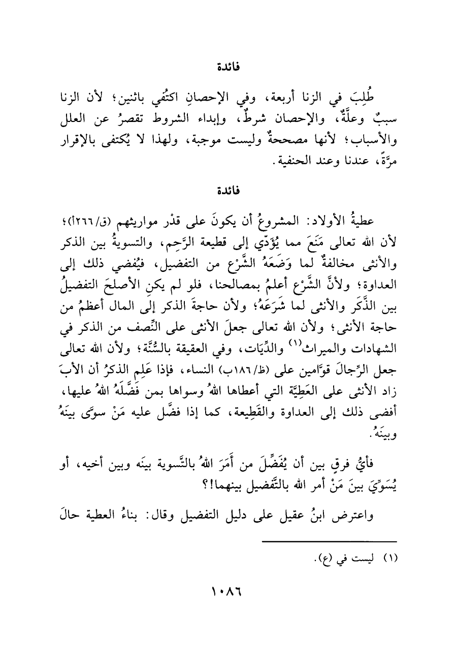 عطيةُ الأولاد: المشروع أن يكون على قدْر مواريثهم (ق/ ٢٦٦ أ)؛ لأن الله تعالى مَنَعَ مما يُؤَدّي إلى قطيعة الرَّحِم، والتسويةُ بين الذكر والأنثى مخالفةٌ لما وَضَعَهُ الشَّرْع هن التفضيل، فيُفضي ذلك إلى العداوة؛ ولأنَّ الشَّرْع أعلمُ بمصالحنا، فلو لم يكنِ الأصلحَ التفضيلُ بين الذَّكَر والأنثى لما أشَرَعَهُ؛ ولأن حاجةَ الذكر إلى المال أعظمُ من حاجة الأنثى، ولأن الله تعالى جعلَ الأنثى على النِّصف من الذكر فى الشهادات والميراث (¬١) والدِّيَات، وفي العقيقة بالسُّنَّة؛ ولأن الله تعالى جعل الرِّجالَ قوَّامين على (ظ/ ١٨٦ ب) النساء، فإذا عَلِمِ الذكرُ أن الأبَ زاد الأنثى على العَطِيَّة التي أعطاها اللهُ وسواها بمن فضَّلَهُ اللهُ عليها، أفضى ذلك إلى العداوة والقَطِيعة، كما إذا فضَّل عليه مَنْ سوَّى بينَهُ وبينَه.