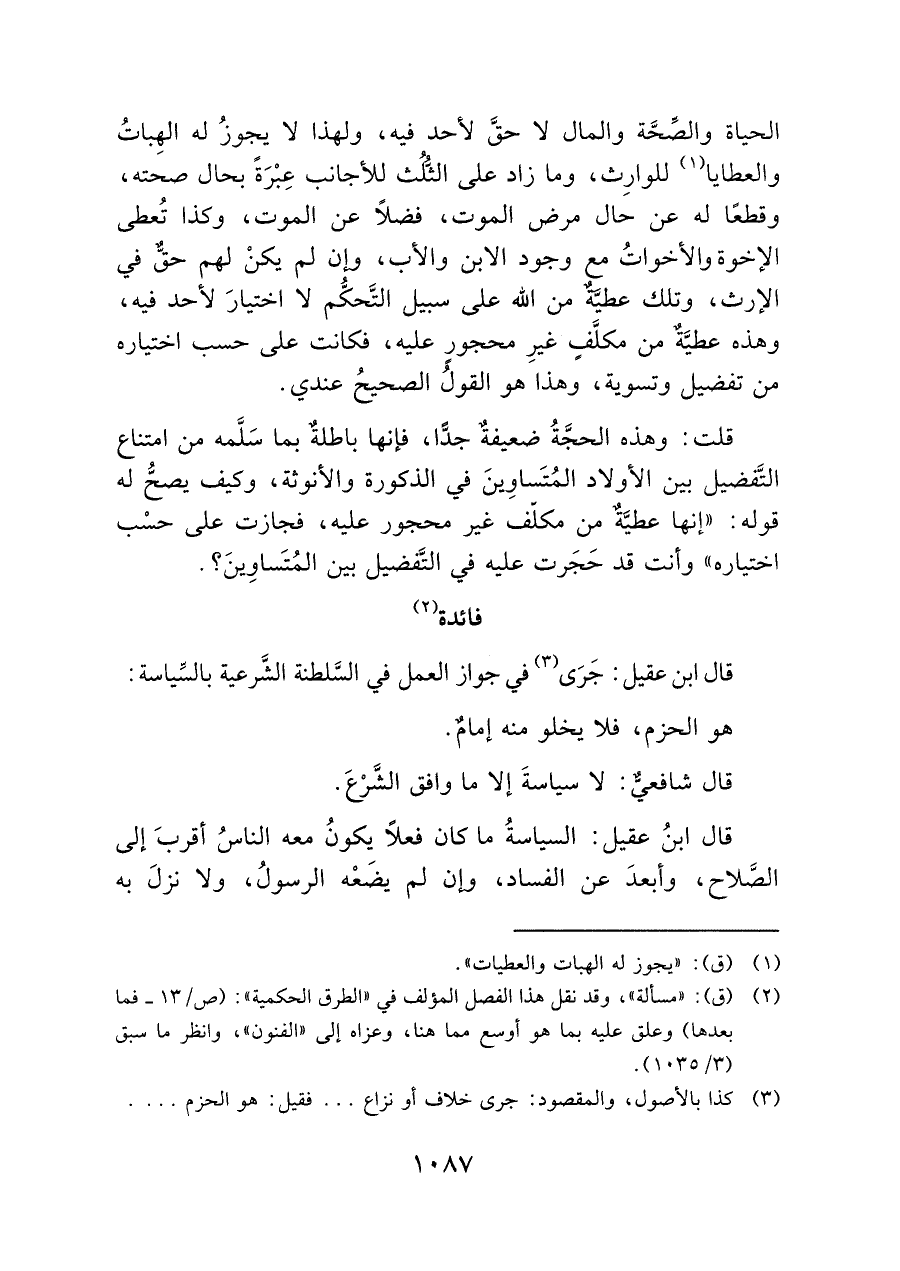 الحياة والصِّحَّة والمال لا حقَّ لأحد فيه، ولهذا لا يجوزُ له الهِباتُ والعطايا (¬١) للوارِث، وما زاد على الثلُث للأجانب عِبْرَةً بحال صحته، وقطعًا له عن حال مرض الموت، فضلًا عن الموت، وكذا تُعطى الإخوة الأخواتُ مع وجود الابن والأب، وإن لم يكنْ لهم حقٌّ في الإرث، وتلك عطيَّةٌ من الله على سبيل التَّحكُّم لا اختيارَ لأحد فيه، وهذه عطيَّةٌ من مكلَّفٍ غيرِ محجورٍ عليه، فكانت على حسب اختياره من تفضيل وتسوية، وهذا هو القولٌ الصحيحُ عندي.