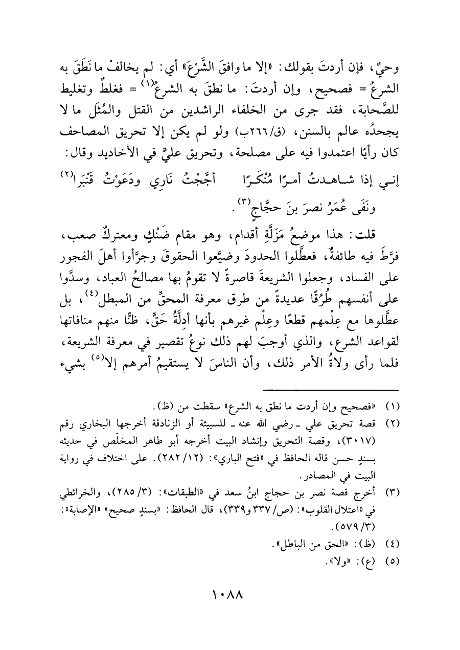 وحيٌ، فإن أردتَ بقولك: "إلا ما وافقَ الشَّرْعَ" أي: لم يخالفْ ما نَطَق به الشرعُ = فصحيح، وإن أردتَ: ما نطقَ به الشرعٌ (¬١) -فغلطٌ وتغليط للصَّحابة، فقد جرى من الخلفاء الراشدين من القتل والمُثَل ما لا يجحدُه عالم بالسنن، (ق/٢٦٦ ب) ولو لم يكن إلا تحريق المصاحف كان رأيًا اعتمدوا فيه على مصلحة، وتحريق عليٍّ في الأخاديد وقال: