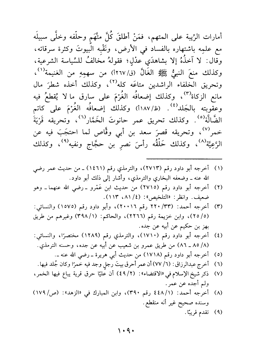 أمارات الرِّيبة على المتهم، فمَنْ أطلقَ كُلَّ متَّهَمٍ وحلّفه وخلَّى سبيلَه مع علمِه باشتهاره بالفساد في الأرض، ونَقْبِه البيوتَ وكثرة سرقاته، وقال: لا آخذُهُ إلا بشاهدَي عدْلٍ؛ فقولهُ مخَالفُ للسِّياسة الشرعية، وكذلك منعَ النبيُّ - صلى الله عليه وسلم - الغَالَّ (ق/ ٢٦٧ أ) من سهمِهِ من الغنيمة (¬١)، وتحريق الخلفاء الراشدين متاعَه كله (¬٢)، وكذلك أخذه شطرَ مال مانع الزكاة (¬٣)، وكذلك إضعافُه الغُرْمَ على سارق ما لا يُقطعُ فيه وعقوبته بالجَلد (¬٤). (ظ/١٨٧ أ) وكذلك إضعافُه الغرْمَ على كاتم الضَّالَّة (¬٥). وكذلك تحريق عمر حانوتَ الخَمَّار (¬٦)، وتحريقه قَرْيَةَ خمر (¬٧)، وتحريقه قصرَ سعد بن أبي وقَّاص لما احتجَبَ فيه عن الرَّعِيَّة (¬٨)، وكذلك حَلْقُه رأسَ نصرِ بن حجَّاج ونفيه (¬٩)، وكذلك