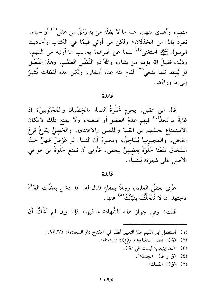 منهم، وأهدى منهم، هذا ما لا يظنُّه من به رَمَقٌ من عقل (¬١) أو حياء، نعوذُ بالله من الخذلان؛ ولكن من أوتي فَهمًا في الكتاب وأحاديث الرسول - صلى الله عليه وسلم - استغنى (¬٢) بهما عن غيرهما بحسب ما أوتيه من الفهم، وذلك فضلُ الله يؤتيه من يشاء، والله ذو الفَضْلُ العظيم، وهذا الفَصْل لو بُسِط كما ينبغي (¬٣) لقام منه عدة: أسفار، ولكن هذه لفظات تشيرُ إلى ما وراءَها.