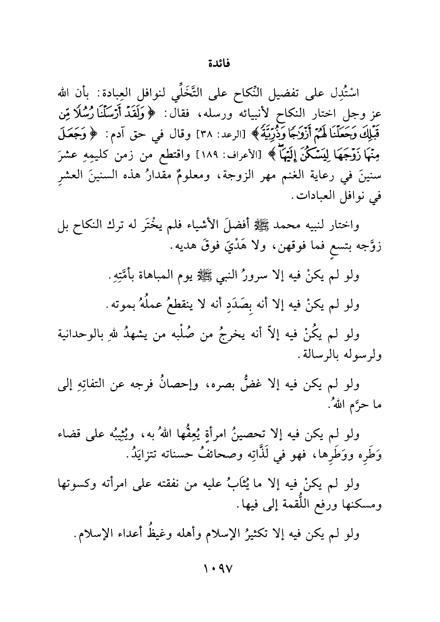 اسْتدِل على تفضيل النِّكاح على التَّخَلِّي لنوافل العِبادة: بأن الله عز وجل اختار النكاحِ لأنبيائه ورسله، فقال: {وَلَقَدْ أَرْسَلْنَا رُسُلًا مِنْ قَبْلِكَ وَجَعَلْنَا لَهُمْ أَزْوَاجًا وَذُرِّيَّةً} [الرعد: ٣٨] وقال في حق آدم: {وَجَعَلَ مِنْهَا زَوْجَهَا لِيَسْكُنَ إِلَيْهَا} [الأعراف: ١٨٩] واقتطع من زمن كليمهِ عشرَ سنينَ في رعاية الغنم مهر الزوجة، ومعلومٌ مقدارُ هذه السنينَ العشرِ في نوافل العبادات.