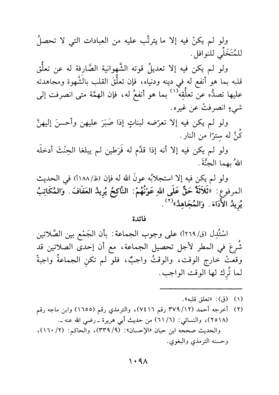 ولو لم يكن فيه إلا استجلابُه عونَ الله له فإن (ظ / ١٨٨ أ) في الحديث المرفوع: "ثَلاثَةٌ حَقٌّ علَى اللهِ عَوْنُهُمْ: النَّاكحُ يُريدُ العَفَافَ. وَالمُكَاتِبُ يُرِيد الأَدَاءَ، وَالمُجَاهِدُ" (¬٢).