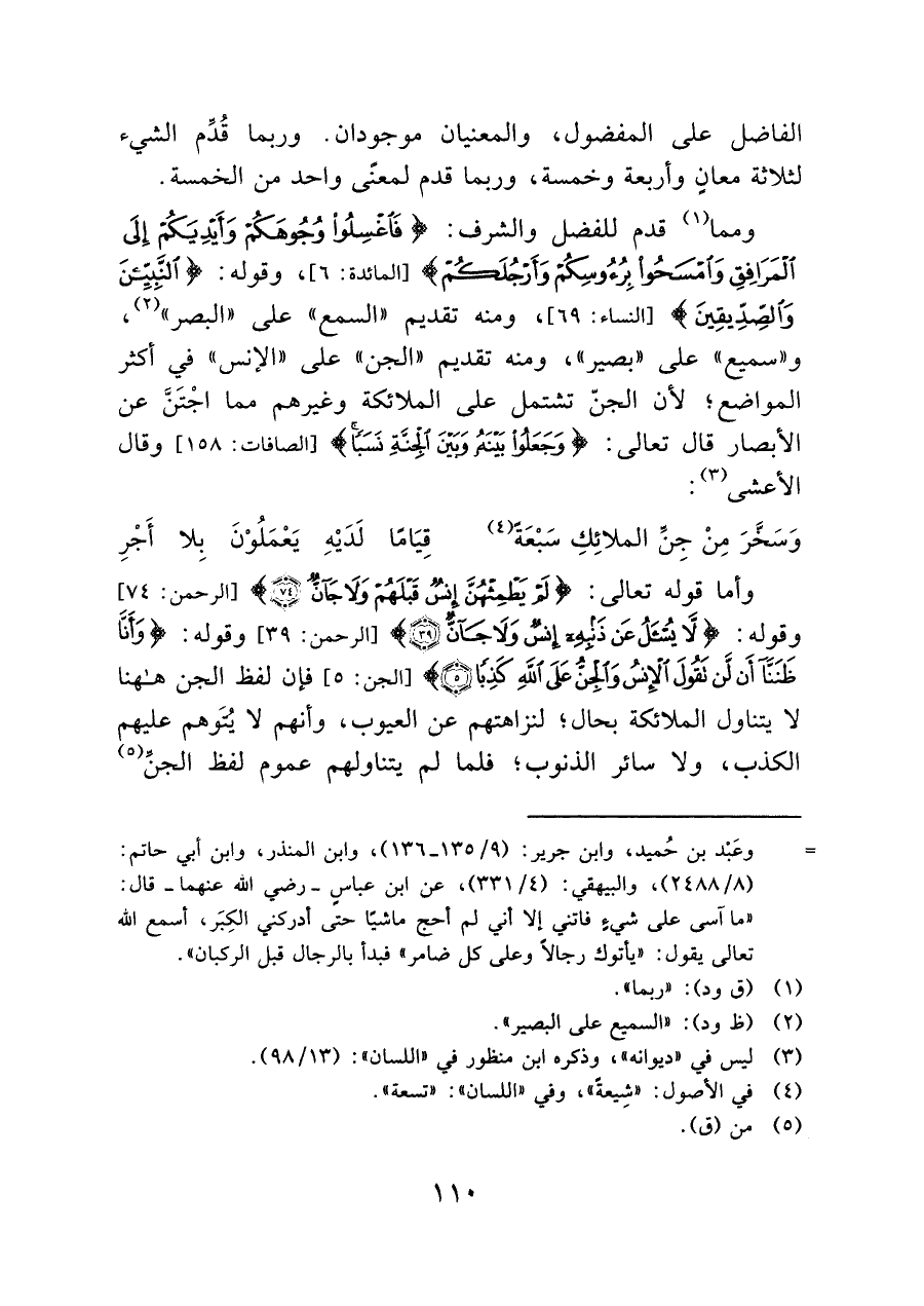 ومما (¬١) قدم للفضل والشرف: {فَاغْسِلُوا وُجُوهَكُمْ وَأَيْدِيَكُمْ إِلَى الْمَرَافِقِ وَامْسَحُوا بِرُءُوسِكُمْ وَأَرْجُلَكُمْ} [المائدة: ٦]، وقوله: {النَّبِيِّينَ وَالصِّدِّيقِينَ} [النساء: ٦٩]، ومنه تقديم "السمع" على "البصر" (¬٢)، و"سميع" على "بصير"، ومنه تقديم "الجن" على "الإنس" في أكثر المواضع؛ لأن الجنّ تشتمل على الملائكة وغيرهم مما اجْتَنَّ عن الأبصار قال تعالى: {وَجَعَلُوا بَيْنَهُ وَبَيْنَ الْجِنَّةِ نَسَبًا} [الصافات: ١٥٨] وقال الأعشى (¬٣):