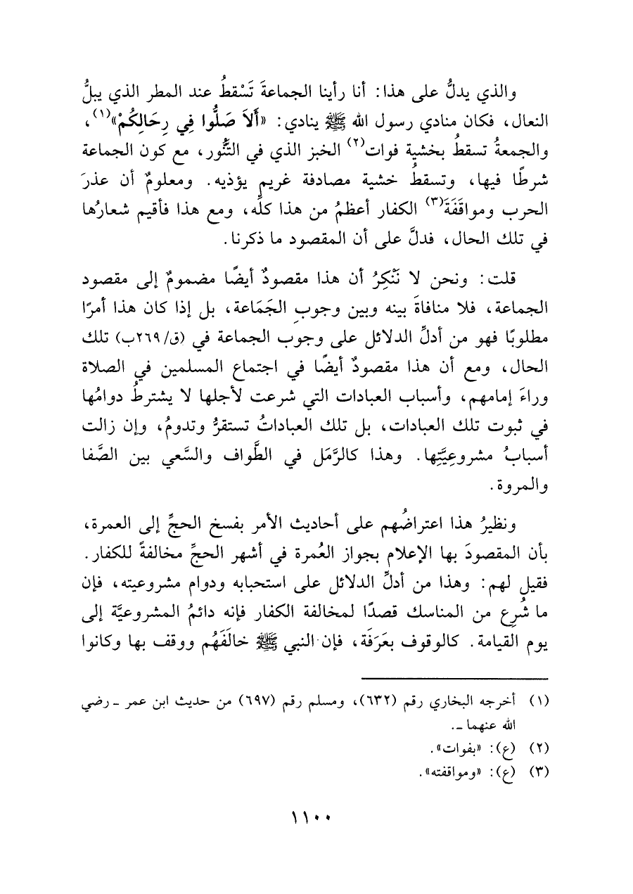 ونظير هذا اعتراضهم على أحاديث الأمر بفسخ الحجِّ إلى العمرة، بأن المقصودَ بها الإعلام بجواز العُمرة في أشهر الحجِّ مخالفة للكفار. فقيل لهمك وهذا من أدلِّ الدلائل على استحبابه ودوام مشروعيته، فإن ما شُرِع من المناسك قصدًا لمخالفة الكفار فإنه دائمُ المشروعيَّة إلى يوم القيامة. كالوقوف: بعَرفة، فإن النبي - صلى الله عليه وسلم - خالَفَهُم ووقف بها وكانوا
