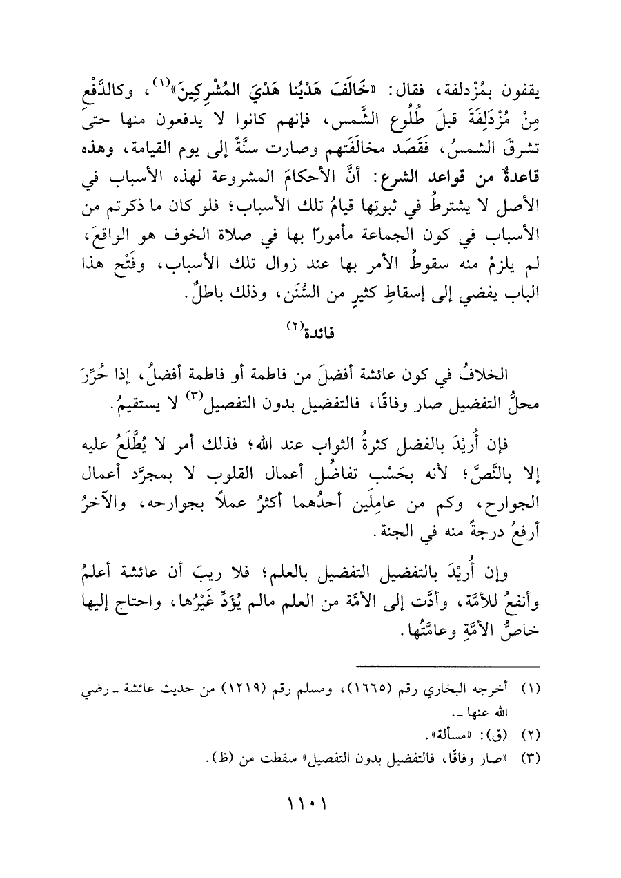 الخلافُ في كون عائشة أفضلَ من فاطمة أو فاطمة أفضلُ، إذا حُرِّرَ محلُّ التفضيل صار وفاقًا، فالتفضيل بدون التفصيل (¬٣) لا يستقيمُ.