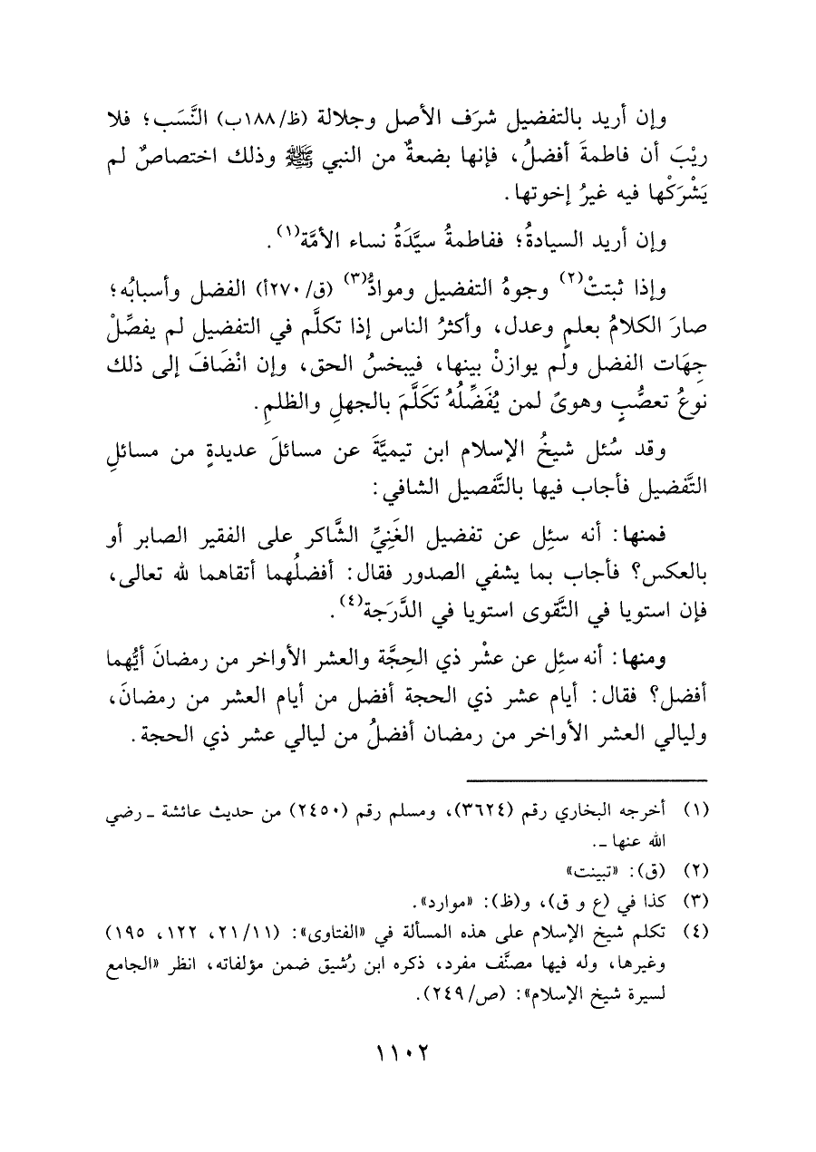 وإذا ثبتتْ (¬٢) وجوهُ التفضيل وموادُّ (¬٣) (ق/٢٧٠ أ) الفضل وأسبابُه؛ صارَ الكلامُ بعلمٍ وعدل، وأكثرُ الناس إذا تكلَّم في التفضيل لم يفصِّلْ جِهَات الفضل ولم يوازن بينها، فيبخسُ الحق، وإن أنْضَافَ إلى ذلك نوع تعصُّبٍ وهوىً لمن يُفَضَلُهُ تكلَّمَ بالجهلِ والظلمِ.