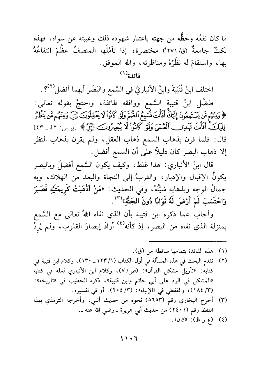 ففضَّل ابنُ قتيبهَ السَّمع ووافقه طائفة، واحتجَّ بقوله تعالى: {وَمِنْهُمْ مَنْ يَسْتَمِعُونَ إِلَيْكَ أَفَأَنْتَ تُسْمِعُ الصُّمَّ وَلَوْ كَانُوا لَا يَعْقِلُونَ (٤٢) وَمِنْهُمْ مَنْ يَنْظُرُ إِلَيْكَ أَفَأَنْتَ تَهْدِي الْعُمْيَ وَلَوْ كَانُوا لَا يُبْصِرُونَ (٤٣)} [يونس: ٤٢، ٤٣]، قال: فلما قرن بذهاب السمع ذهاب العقل، ولم يقرن بذهاب النظر إلا ذهاب البصر كان دليلًا على أن السمع أفضل.