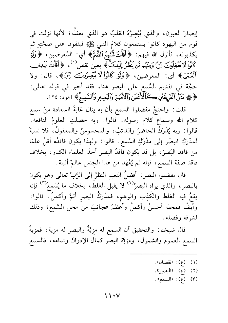 قال شيخنا: والتحقيق أن السمع له مزِيَّةٌ والبصر له مزية، فمزيةُ السمع العموم والشمول، ومزيَّة البصر كمال الإدراك وتمامه، فالسمع