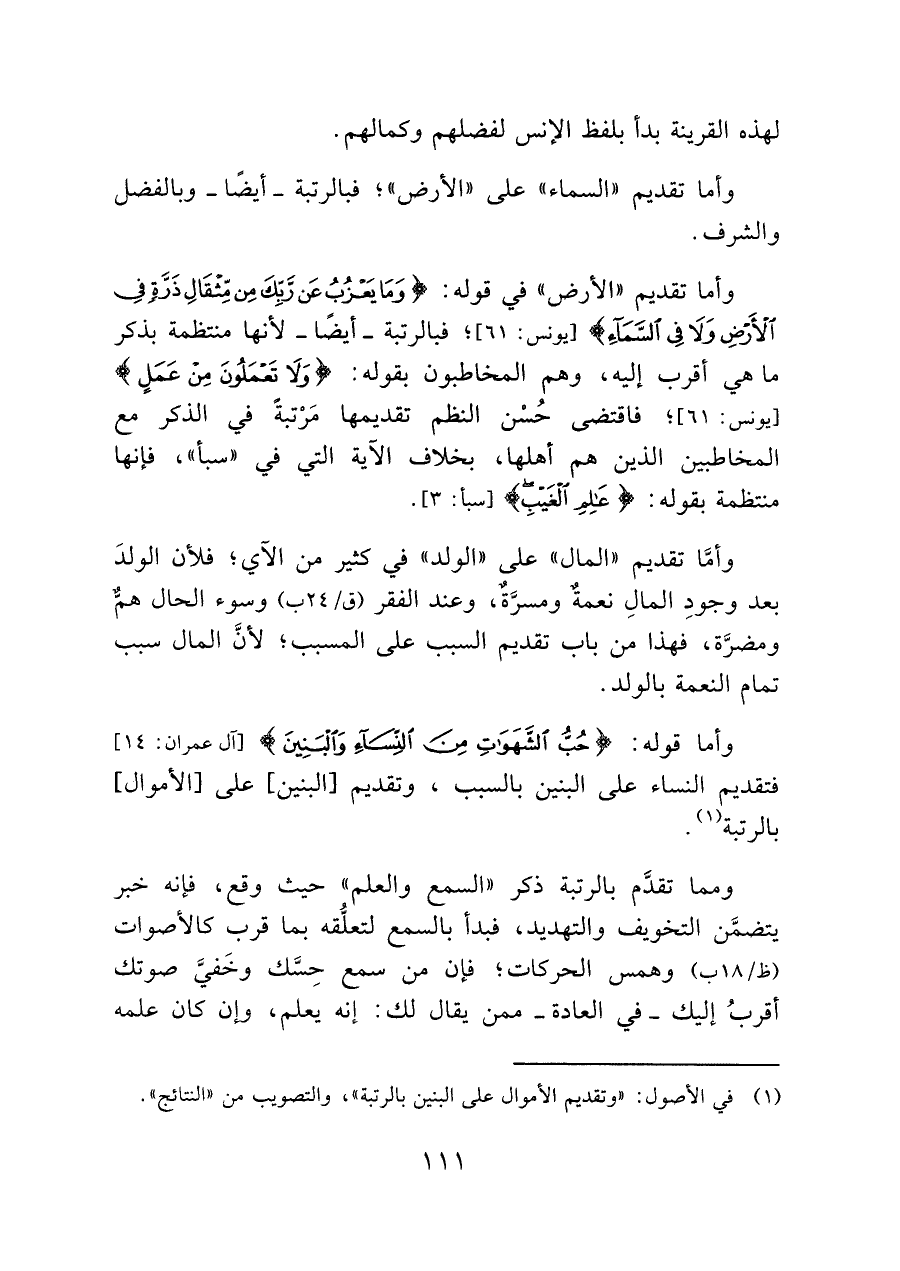 وأمَّا تقديم "المال" على "الولد" في كثير من الآي؛ فلأن الولدَ بعد وجودِ المالِ نعمةٌ ومسرَّةٌ، وعند الفقر (ق/ ٢٤ ب) وسوء الحال همٌّ ومضرَّة، فهذا من باب تقديم السبب على المسبب؛ لأنَّ المال سبب تمام النعمة بالولد.
