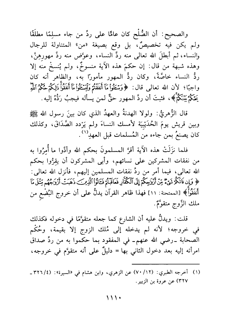 والصحيح: أن الصُّلْح كان عامًّا على ردِّ من جاء مسلِمًا مطلَقًا ولم يكن فيه تخصيصٌ، بل وقع بصيغة "من" المتناولة للرجال النساء، ثم أبطلَ الله تعالى منه ردَّ النساء، وعوَّض منه ردَّ مهورِهِنَّ، وهذه شبهة من قال: إن حكمَ هذه الآية منسوخٌ، ولم يُنسْخ منه إلا ردُّ النساء خاصَّةً، وكان ردُّ المهور مأمورًا به، والظاهر أنه كان واجبًا؛ لأن الله تعالى قال: {وَاسْأَلُوا مَا أَنْفَقْتُمْ وَلْيَسْأَلُوا مَا أَنْفَقُوا ذَلِكُمْ حُكْمُ اللَّهِ يَحْكُمُ بَيْنَكُمْ}، فثبتَ أن ردَّ المهور حقٌّ لمن يسأله فيجُب رَدُّهُ إليه.