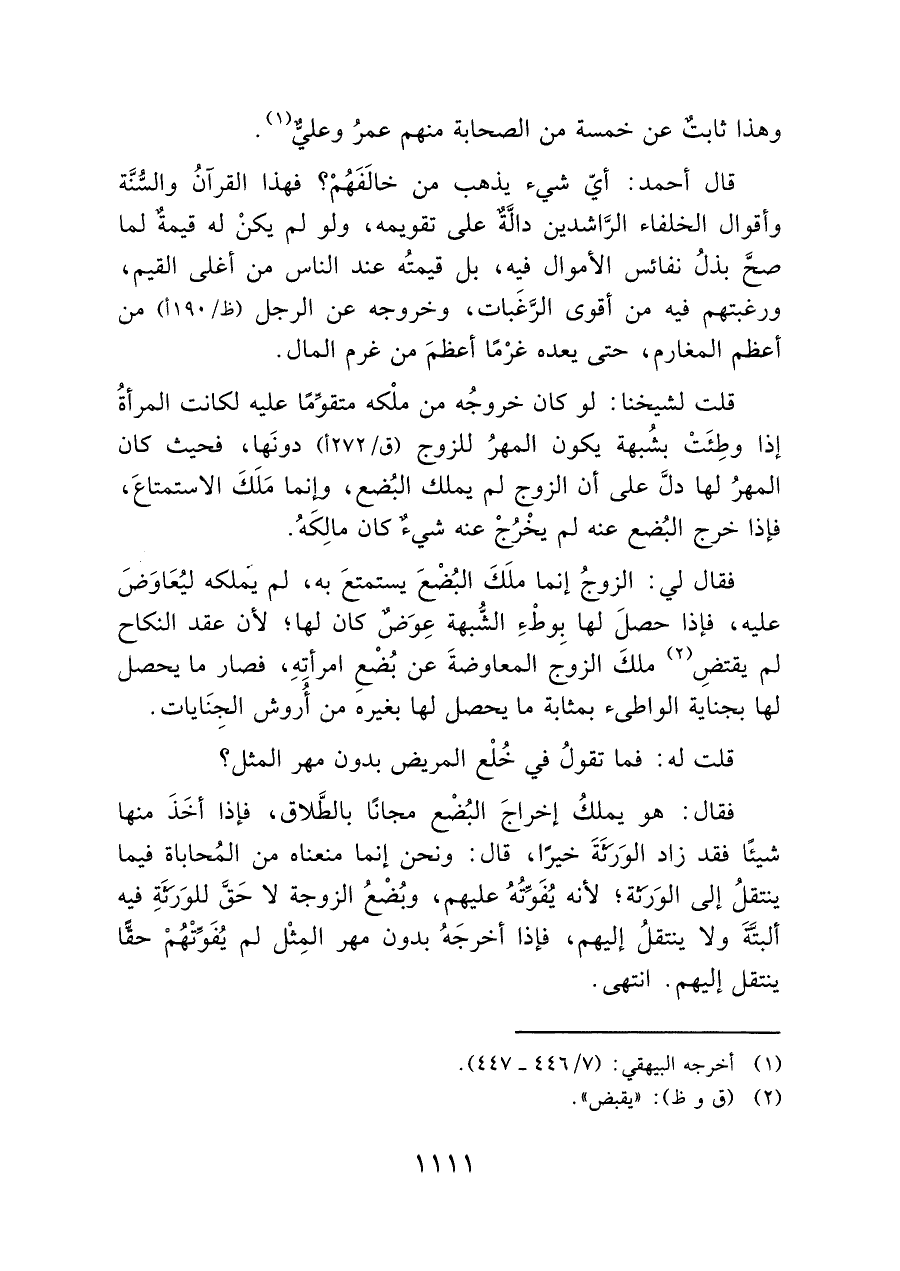 قال أحمد: أيّ شيء يذهب من خالَفَهُمْ؟ فهذا القرآن والسُّنَّة وأقوال الخلفاء لرَّاشدين دالَّةٌ على تقويمه، ولو لم يكنْ له قيمةٌ لما صحَّ بذلُ نفائس الأموال فيه، بل قيمتُه عند الناس من أغلى القيم، ورغبتهم فيه من أقوى الرَّغَبات، وخروجه عن الرجل (ظ / ١٩٠ أ) من أعظم المغارم، حتى يعده غرْمًا أعظمَ من غرم المال.