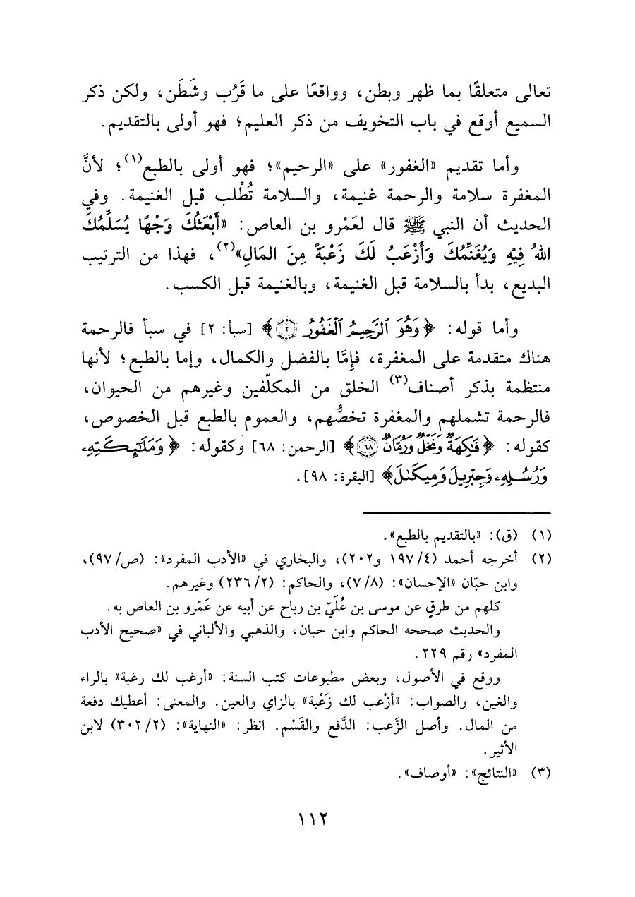 وأما تقديم "الغفور" على "الرحيم"؛ فهو أولى بالطبع (¬١)؛ لأنَّ المغفرة سلامة والرحمة غنيمة، والسلامة تُطْلب قبل الغنيمة. وفي الحديث أن النبي - صلى الله عليه وسلم - قال لعَمْرو بن العاص: "أَبْعَثُكَ وَجْهاً يُسَلِّمُكَ اللهُ فِيْهِ وَيُغَنِّمُكَ وَأَزْعَبُ لَكَ زَعْبَةً مِنَ المَالِ" (¬٢)، فهذا من الترتيب البديع، بدأ بالسلامة قبل الغنيمة، وبالغنيمة قبل الكسب.