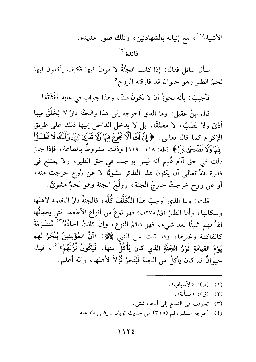 سأل سائل فقال: إذا كانت الجنَّةُ لا موتَ فيها فكيف يأكلون فيها: لحمَ الطير وهو حيوان قد فارقته الروح؟