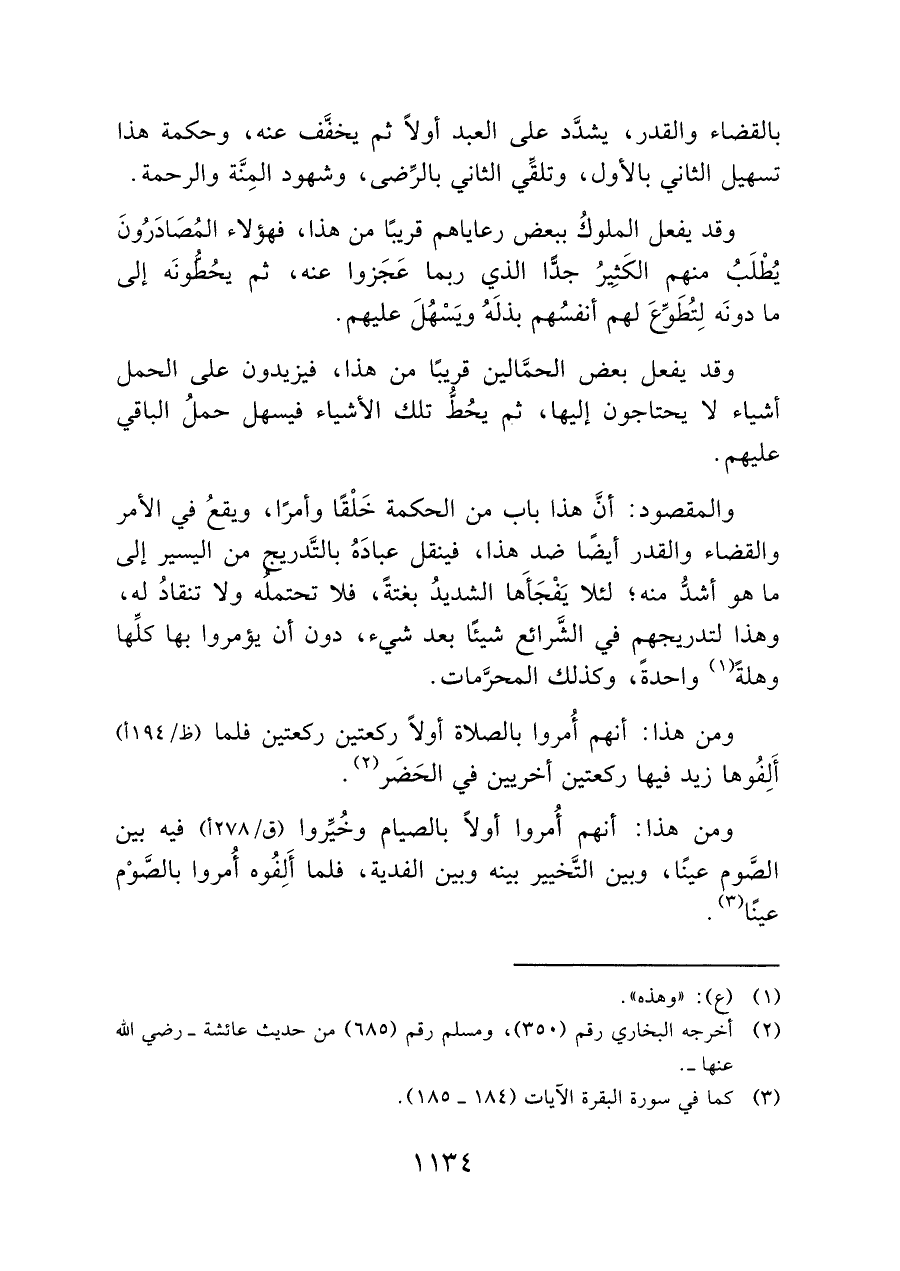 والمقصود: أنَّ هذا باب من الحكمة خَلْقًا وأمرًا، ويقعُ في الأمر والقضاء والقدر أيضًا ضد هذا، فينقل عبادَهُ بالتَّدريج من اليسير إلى ما هو أشدُّ منه؛ لئلا يفجَأَها الشديدُ بغتةً، فلا تحتملُه ولا تنقادُ له، وهذا لتدريجهم في الشَّرائع شيئًا بعد شيء، دون أن يؤمروا بها كلِّها وهلةً (¬١) واحدةً، وكذلك المحرَّمات.
