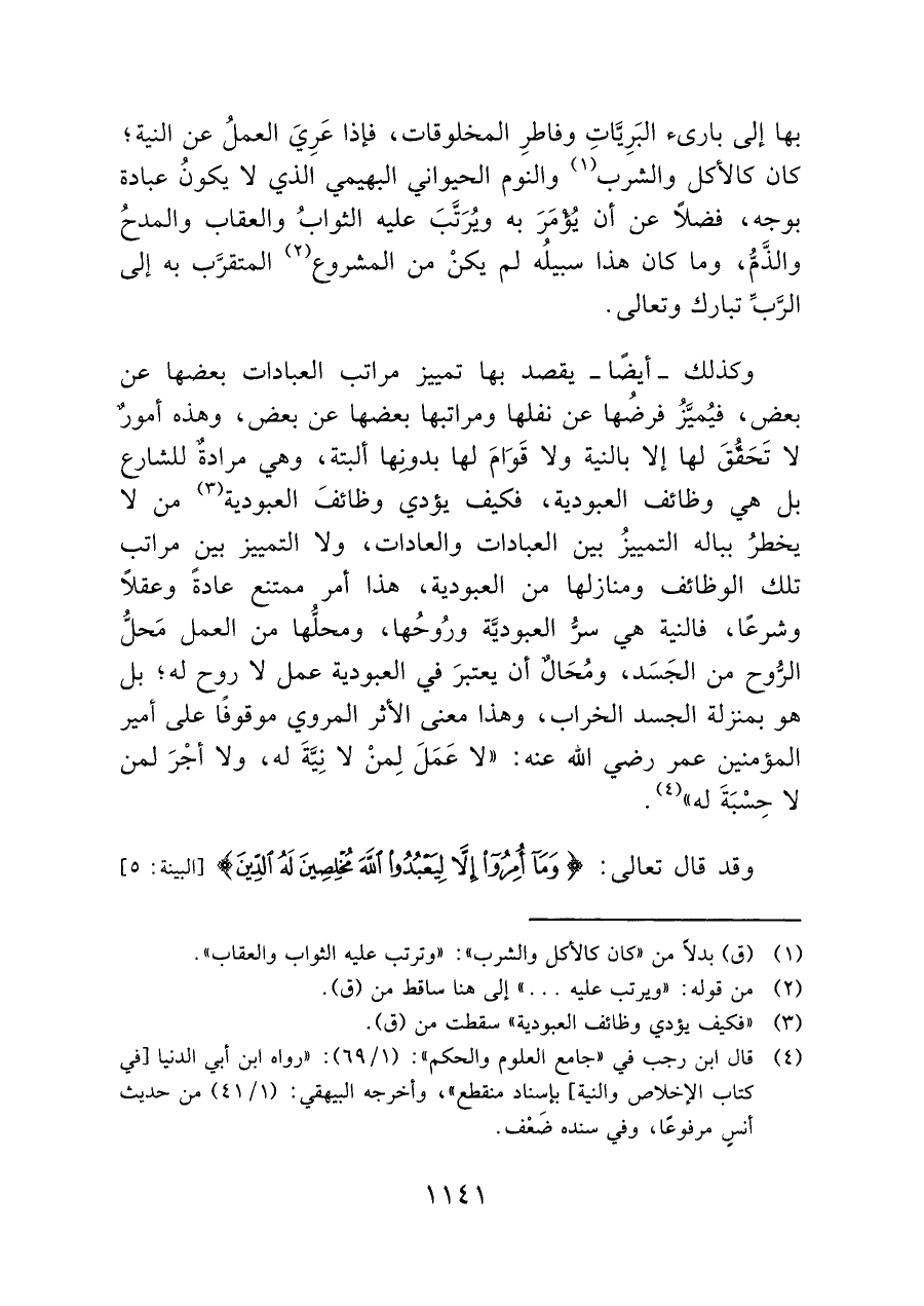 وكذلك -أيضًا- يقصد بها تمييز مراتب العبادات بعضها عن بعض، فيُميَّزُ فرضها عن نفلها ومراتبها بعضها عن بعض، وهذه أمورٌ لا تَحَقُّقَ لها إلا بالنية ولا قَوَامَ لها بدونِها ألبتة، وهى مرادةٌ للشارع بل هى وظائف العبودية، فكيف يؤدي وظائفَ العبودية (¬٣) من لا يخطرُ بباله التمييزُ بين العبادات والعادات، ولا التمييز بين مراتب تلك الوظائف ومنازلها من العبودية، هذا أمر ممتنع عادةً وعقلاً وشرعًا، فالنية هى سرُّ العبوديَّة ورُوحُها، ومحلُّها من العمل مَحلُّ الرُّوح من الجَسَد، ومُحَالٌ أن يعتبرَ في العبودية عمل لا روح له؛ بل هو بمنزلة الجسد الخراب، وهذا معنى الأثر المروي موقوفًا على أمير المؤمنين عمر رضي الله عنه: "لا عَمَلَ لِمنْ لا نِيَّةَ له، ولا أجْرَ لمن لا حَسَنَةَ له" (¬٤).