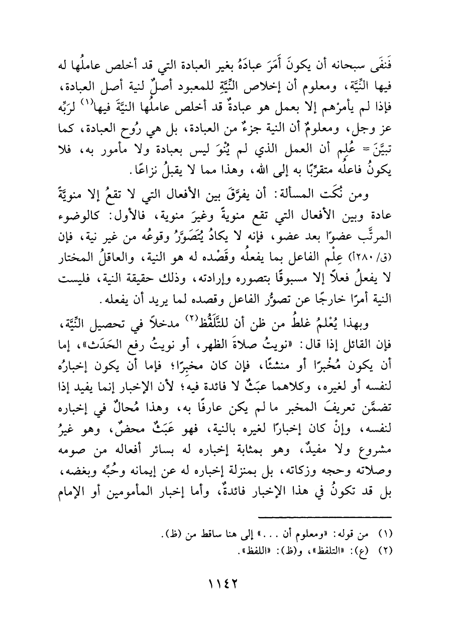 وبهذا يعْلمُ غلطُ من ظن أن للتَّلَفُّظ (¬٢) مدخلاً في تحصيل النِّيَّة، فإن القائل إذا قال: "نويتُ صلاةَ الظهر، أو نويتُ رفع الحَدَث"، إما أن يكون مخْبرًا أو منشئًا، فإن كان مخبِرًا؛ فإما أن يكون إخبارُه لنفسه أو لغيره، وكلاهما عبَثٌ لا فائدة فيه؛ لأن الإخبار إنما يفيد إذا تضمَّن تعريفَ المخبر ما لم يكن عارفًا به، وهذا مُحالٌ في إخباره لنفسه، وإنْ كان إخبارًا لغيره بالنية، فهو عَبَثٌ محضٌ، وهو غيرُ مشروع ولا مفيدٌ، وهو بمثابة إخباره له بسائر أفعاله من صومه وصلاته وحجه وزكاته، بل بمنزلة إخباره له عن إيمانه وحُبِّه وبغضه، بل قد تكونُ في هذا الإخبار فائدةٌ، وأما إخبار المأمومين أو الإمام