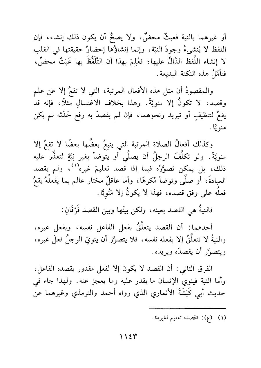 أو غيرهما بالنية فعبثٌ محضٌ، ولا يصحُّ أن يكون ذلك إنشاء، فإن اللفظ لا يُنشئُ وجودَ النيّة، وإنما إنشاؤُها إحضارُ حقيقتها في القلب لا إنشاء اللَّفظ الدَّالِّ عليها؛ فعُلِمَ بهذا أن التَّلَفُّظَ بها عَبَثٌ محضٌ، فتأمَّلْ هذه النكتة البديعة.