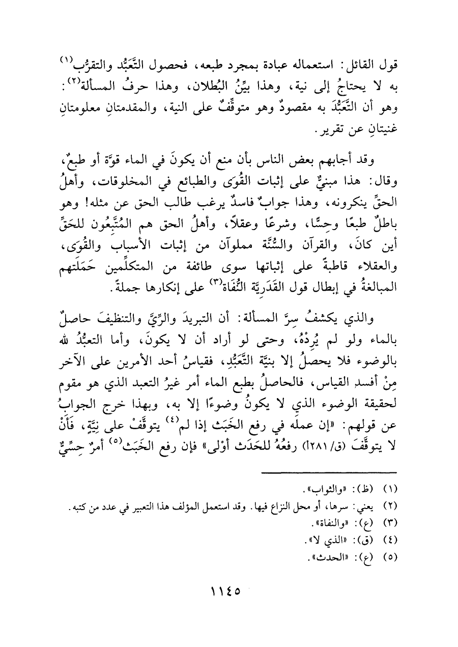 قول القائل: استعماله عبادة بمجرد طبعه، فحصول التَّعَبُّد والتقرُّب (¬١) به لا يحتاجُ إلى نية، وهذا بيِّنُ البُطلان، وهذا حرفُ المسألة (¬٢): وهو أن التَّعَبُّدَ به مقصودٌ وهو متوقِّفٌ على النية، والمقدمتانِ معلومتانِ غنيتانِ عن تقرير.