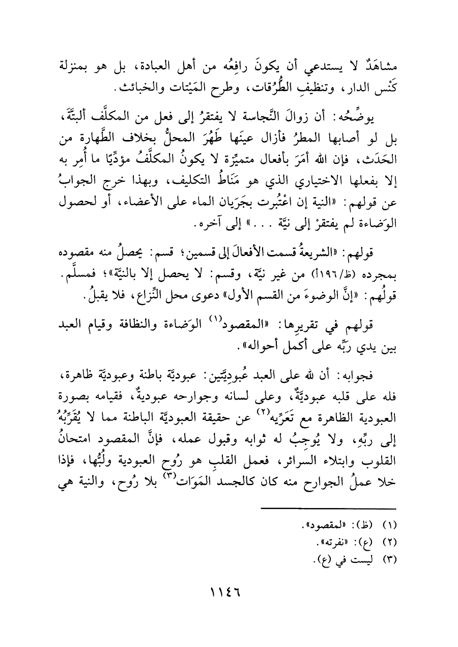 قولهم في تقريرِها: "المقصود (¬١) الوَضاءة والنظافة وقيام العبد بين يدي رَبَّه على أكمل أحواله".