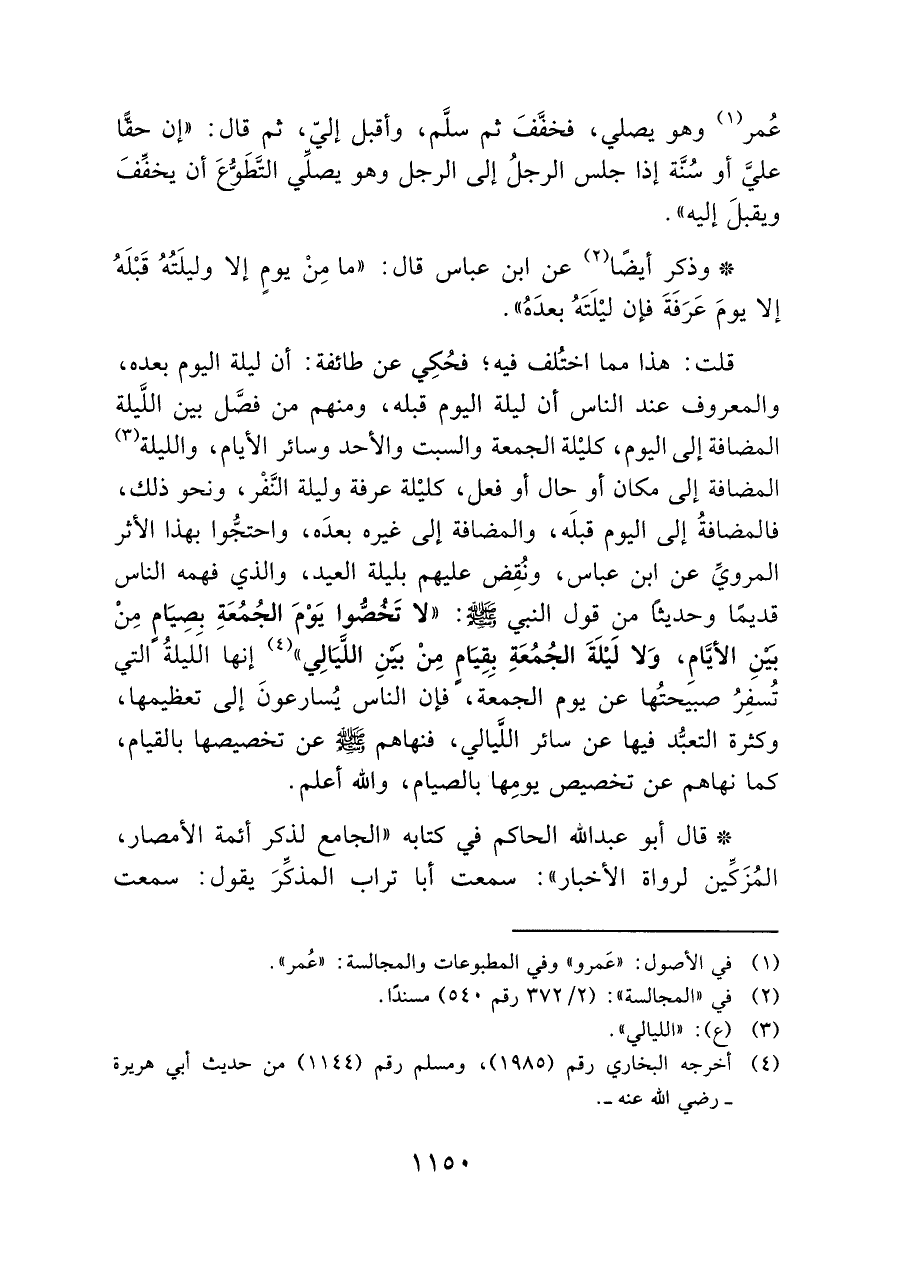 قلت: هذا مما اختُلف فيه، فحُكِي عن طائفة: أن ليلة اليوم بعده، والمعروف عند الناس أن ليلة اليوم قبله، ومنهم من فصَّل بين اللَّيلة المضافة إلى اليوم، كليْلة الجمعة والسبت والأحد وسائر الأيام، والليلة (¬٣) المضافة إلى مكان أو حال أو فعل، كليْلة عرفة وليلة النَّفْر، ونحو ذلك، فالمضافةُ إلى اليوم قبلَه، والمضافة إلى غيره بعدَه، واحتجُّوا بهذا الأثر المرويِّ عن ابن عباس، ونُقِض عليهم بليلة العيد، والذي فهمه الناس قديمًا وحديثاً من قول النبي - صلى الله عليه وسلم -: "لا تَخُصُّوا يَوْمَ الجُمُعَةِ بصِيَامٍ منْ بَيْنِ الأيَّامِ، وَلا لَيْلَةَ الجُمُعَةِ بقِيَامٍ مِنْ بَيْنِ اللَّيَالِي" (¬٤) إنها الليلةُ التي تُسفِرُ صبيَحتُها عن يوم الجمعَة، فإن الناس يُسارعونَ إلى تعظيمها، وكثرة التعبُّد فيها عن سائر اللَّيالي، فنهاهم - صلى الله عليه وسلم - عن تخصيصها بالقيام، كما نهاهم عن تخصيص يومِها بالصيام، والله أعلم.
