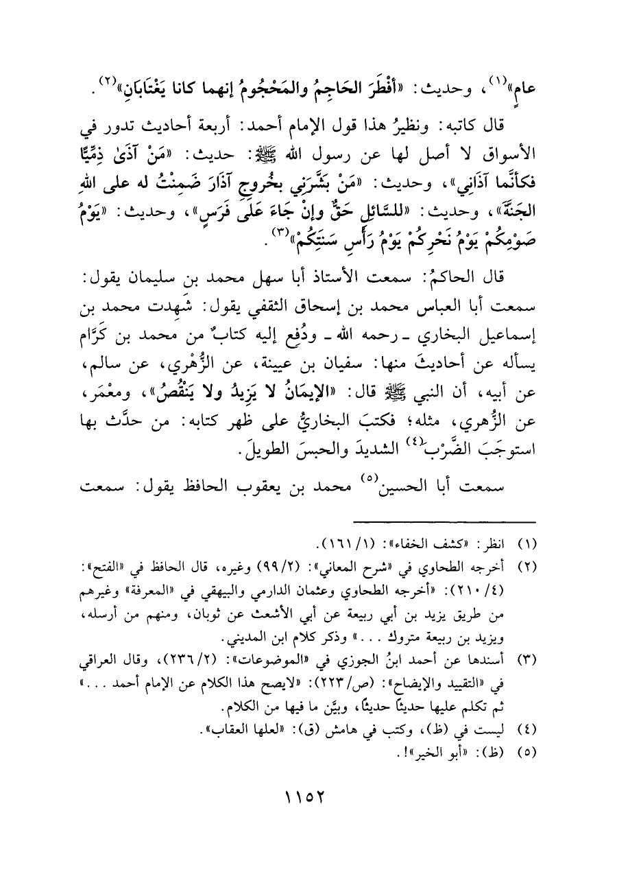 قال كاتبه:: ونظيرُ هذا قول الإمام أحمد: أربعة أحاديث تدور في الأسواق لا أصل لها عن رسول الله - صلى الله عليه وسلم -: حديث: "مَنْ آذَى ذِمِّيًّا فكأنَّما آذَانِي"، وحديث: "مَنْ بَشَّرَنِي بخُروجِ آذَارَ ضَمِنْتُ له على اللهِ الجَنَّةَ"، وحديث: "للسَّائِل حَقٌّ وإنْ جَاءَ عَلى فَرَسٍ"، وحديث: "يَوْمُ صَوْمِكُمْ يَوْمُ نَحْرِكُمْ يَوْمُ رَأَسِ سَنَتِكُمْ" (¬٣).