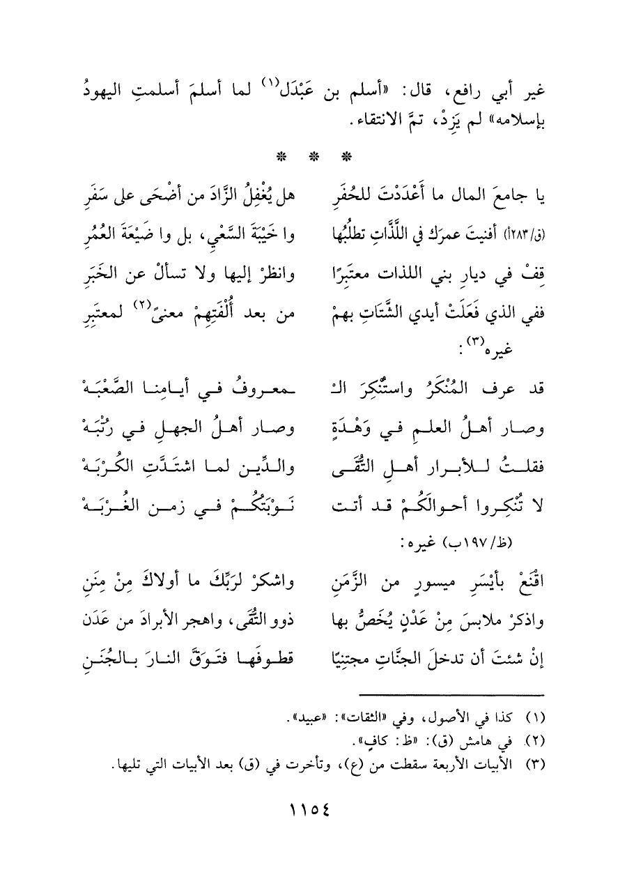 (ق/ ٢٨٣ أ) أفنيتَ عمرَك في اللَّذَّاتِ تطلُبُها ... وا خَيْبَةَ السَّعْيِ، بل وا ضَيْغَةَ العُمُرِ